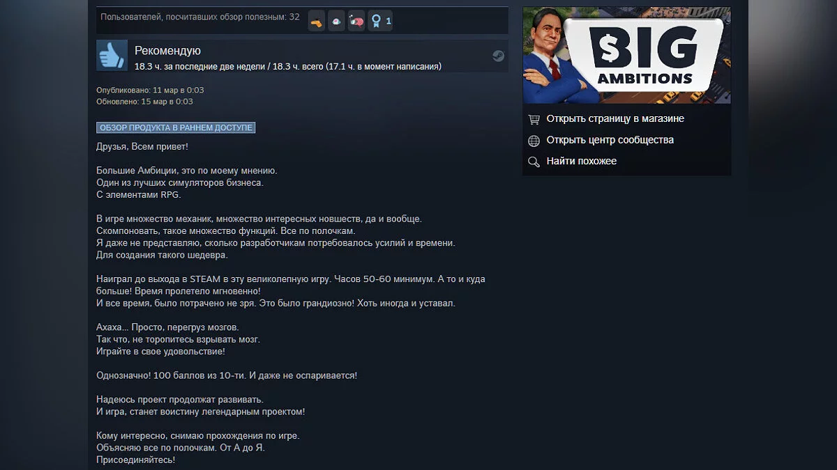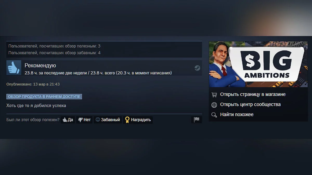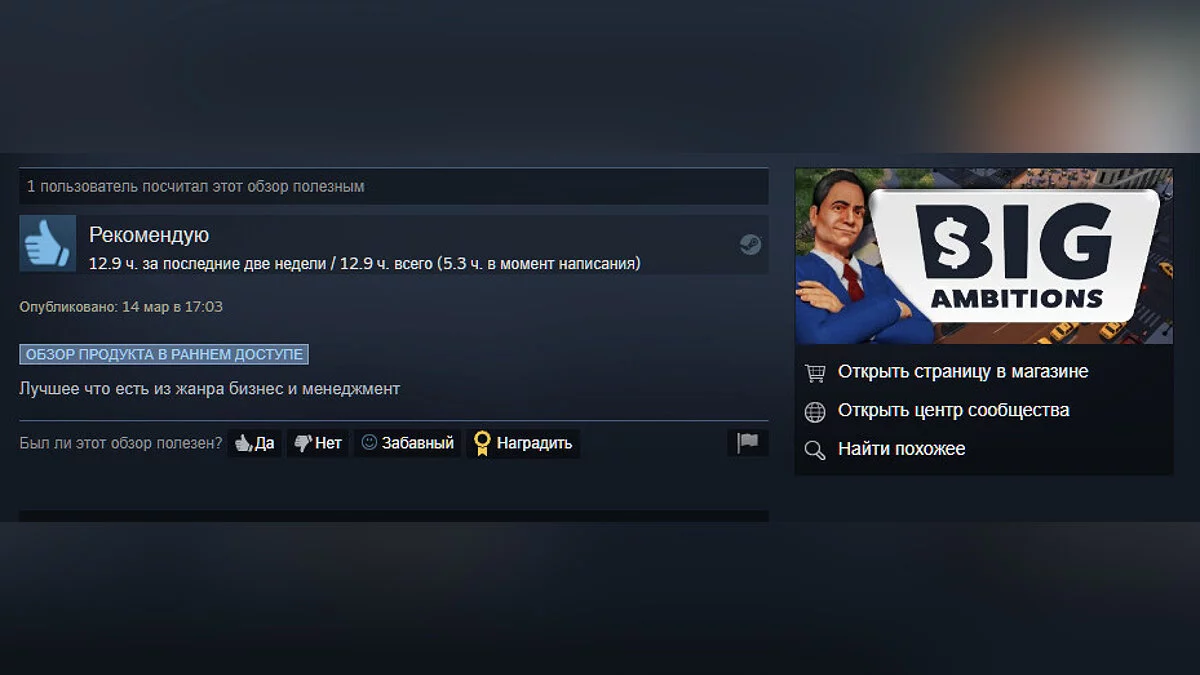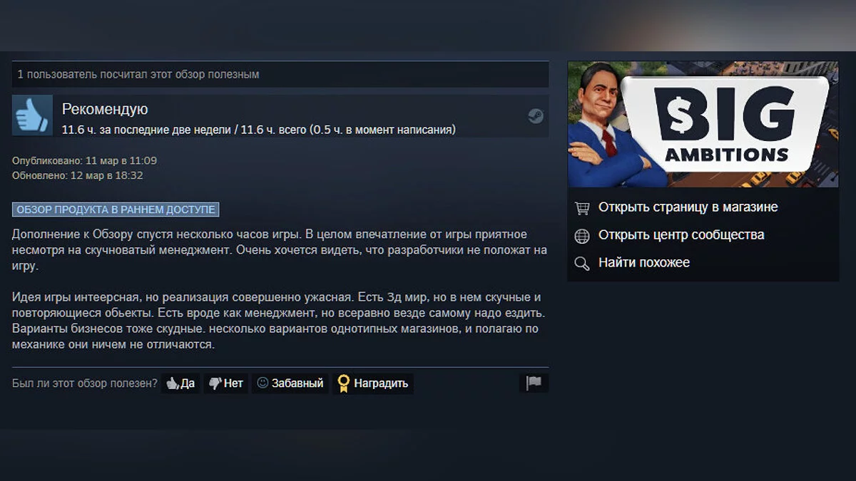 Сейчас рейтинг составляет 96%. Пользователи хвалят Big Ambitions за вызывающий привыкание геймплей и в целом описывают игру как мирную версию GTA.