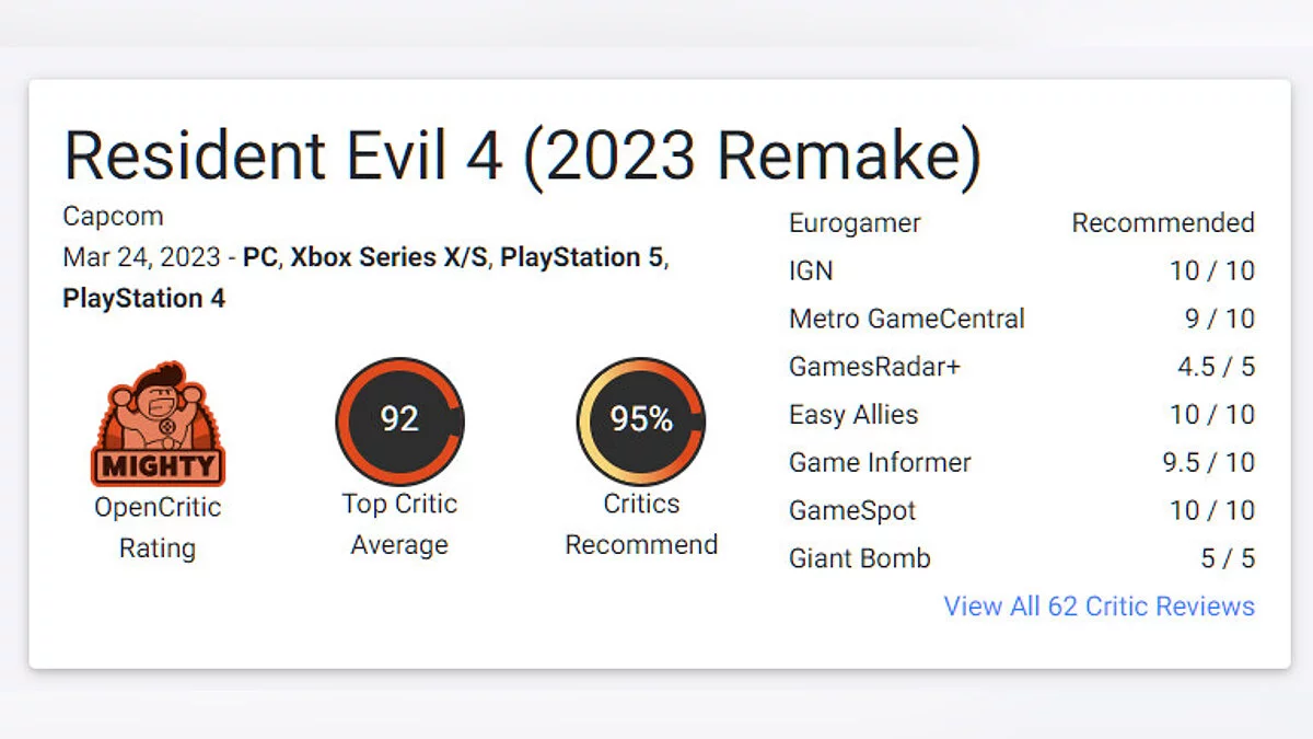 Обновленной «четверке» не хватило лишь двух баллов до оригинальной Resident Evil 4. Зато игра превзошла ремейк Resident Evil 2, у которого 92 балла.