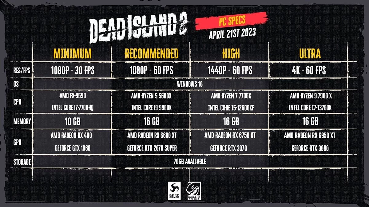 В сети появились системные требования ПК-версии зомби-экшена Dead Island 2. Для запуска игры в 1080p и 30 FPS потребуются как минимум ОС Windows 10, процессор AMD FX-9590 или Intel Core i7-7700 HQ, 10 ГБ оперативной памяти и видеокарта AMD Radeon RX 480 или NVIDIA GeForce GTX 1060.