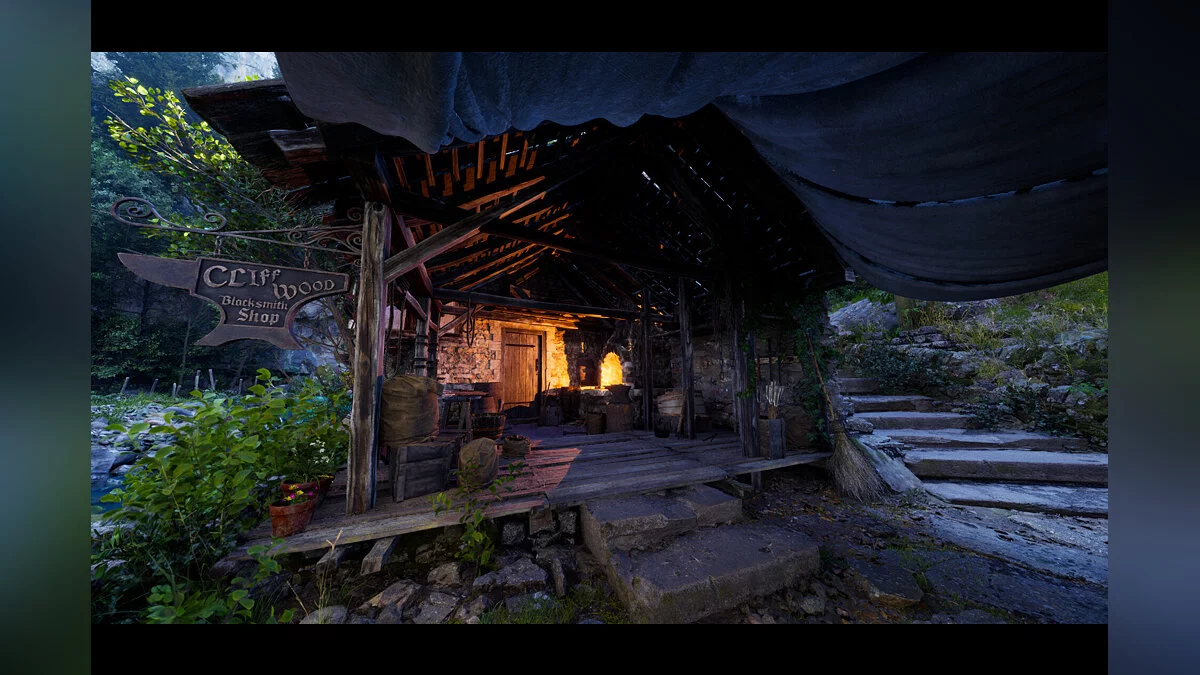 Cliffwood Village — это дипломная работа, на которую ушло восемь месяцев работы. Автор вдохновлялся швейцарскими и английскими пейзажами, но также добавил элементы фэнтези вроде гигантской скалы на фоне. Благодаря этому мир немного напоминает Ривервуд из Skyrim.