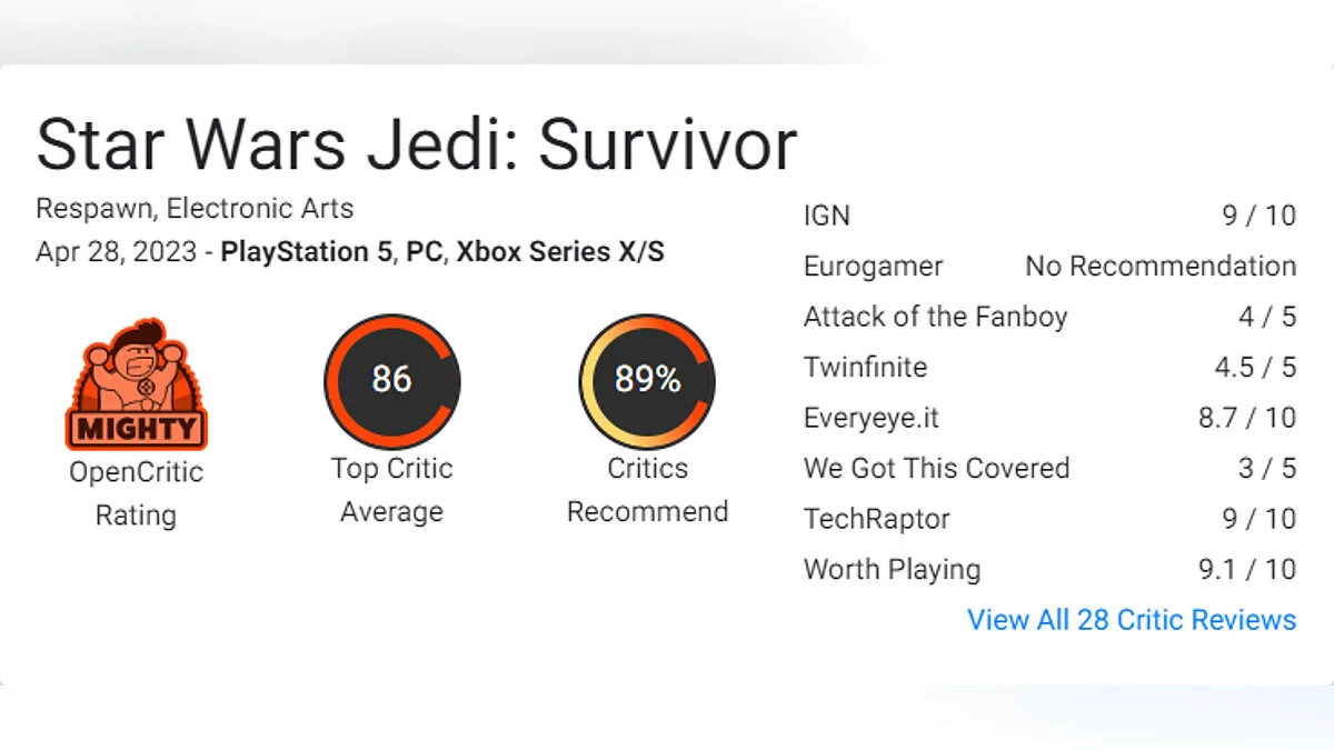 EA сняла эмбарго на публикацию обзоров экшена Star Wars Jedi: Survivor. Проект ожидаемо получил высокие оценки от критиков — средний балл на OpenCritic и Metacritic составляет 86/100.