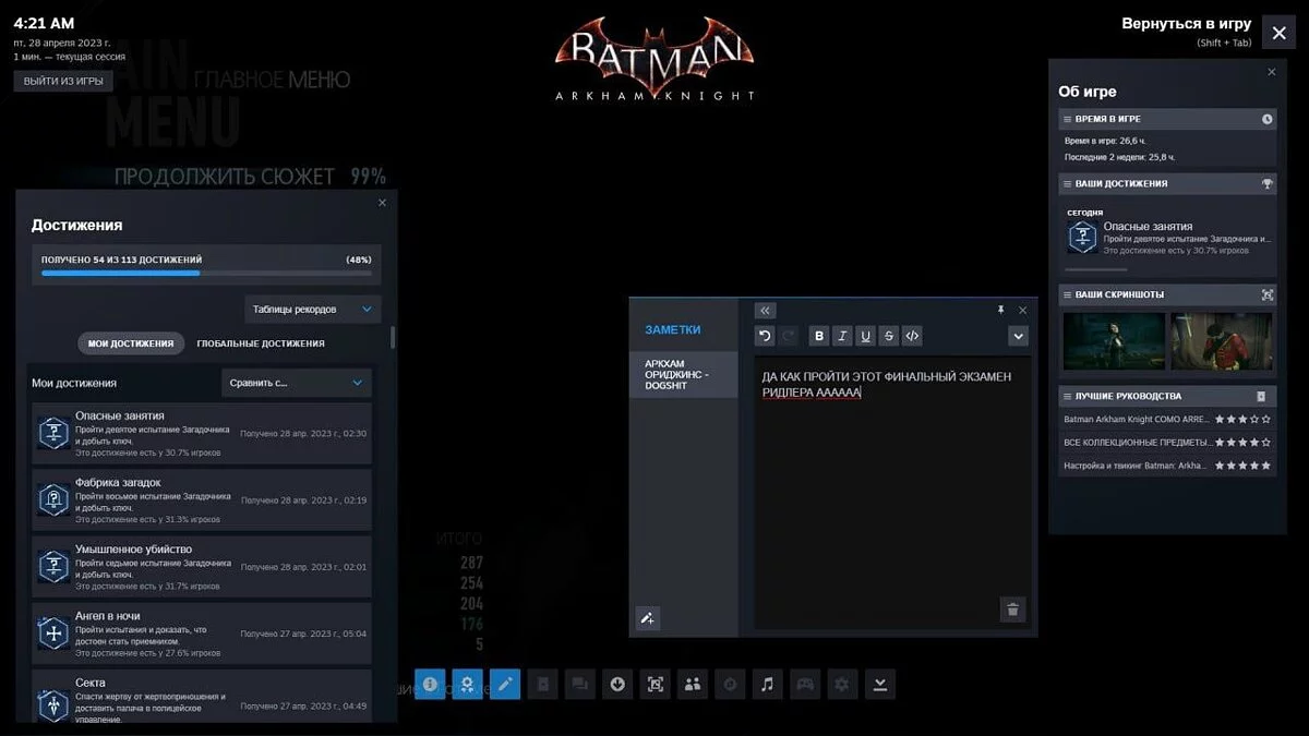 - Добавлена специальная опция, позволяющая быстро посмотреть прогресс получения достижений, игровое время, скриншоты и другую полезную информацию;