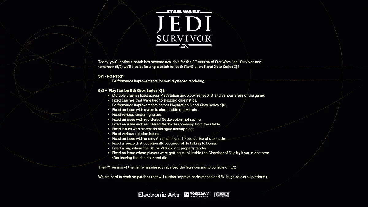 Respawn Entertainment объявила о выходе патча для Star Wars Jedi: Survivor. Пока что он доступен только на PC, но завтра появится и на PS5 с Xbox Seires X/S.