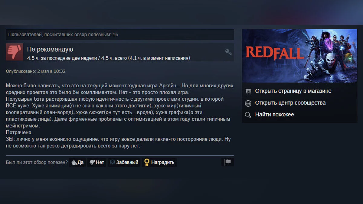 2 мая состоялся релиз кооперативного шутера Redfall от Arkane Studios, авторов серии Dishonored и Prey. Увы, но первые оценки не вселяют надежду: у игры всего 66 баллов на Opencritic и 64 балла на Metacritic.
