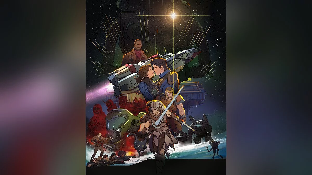Отсылок довольно много — тут и Довакин из Skyrim, и Корво из дилогии Dishonored, и Думгай с Би Джей Бласковицем. В центре также разместились звездолет из Starfield и станция «Талос-1» из Prey.