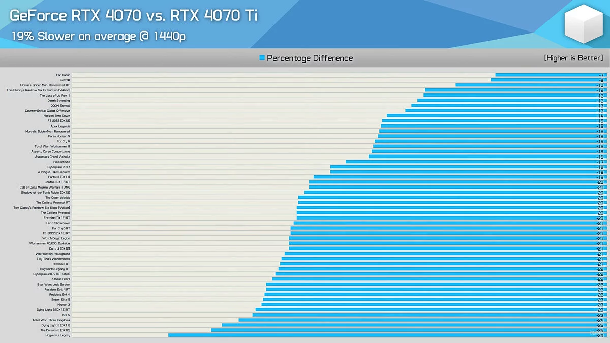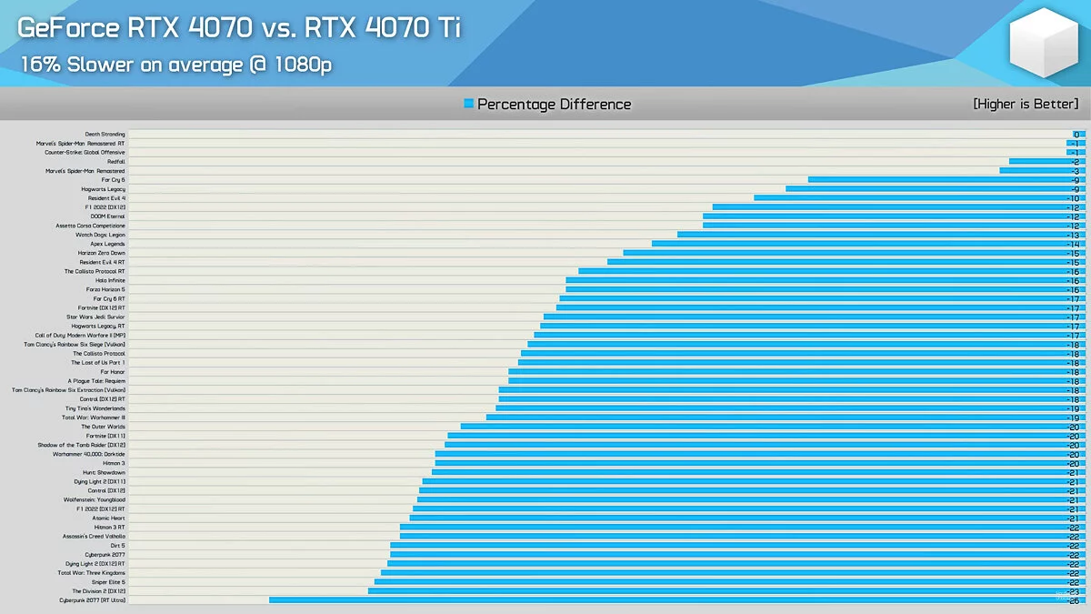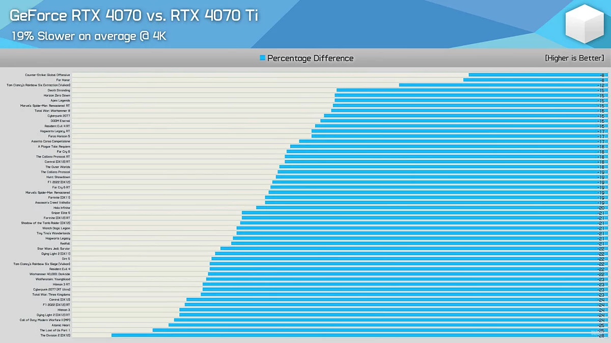 На YouTube-канале Hardware Unboxed появилось сравнение видеокарт NVIDIA GeForce RTX 4070 и NVIDIA GeForce RTX 4070 Ti в 40 известных играх, среди которых есть Cyberpunk 2077, Atomic Heart, Dying Light 2, The Last of Us Part 1, Far Cry 6, Hogwarts Legacy, Resident Evil 4 Remake и Redfall.