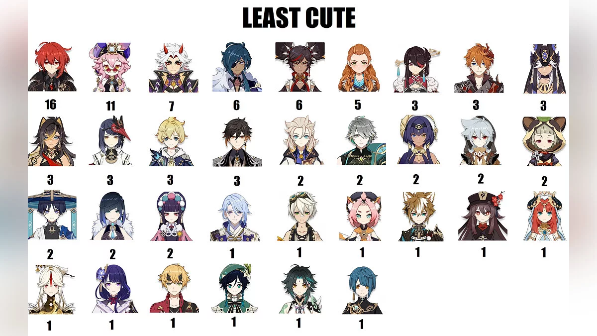 В списке наименее приятных персонажей оказались Дилюк (16 голосов), Дори (11 голосов) и Аратаки Итто (8 голосов).