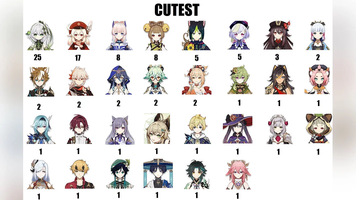 В Genshin Impact полным-полно красивых героинь, но какая из них самая милая? Чтобы ответить на этот вопрос, реддитор alonedead провел опрос среди сотни геймеров на европейском сервере игры.