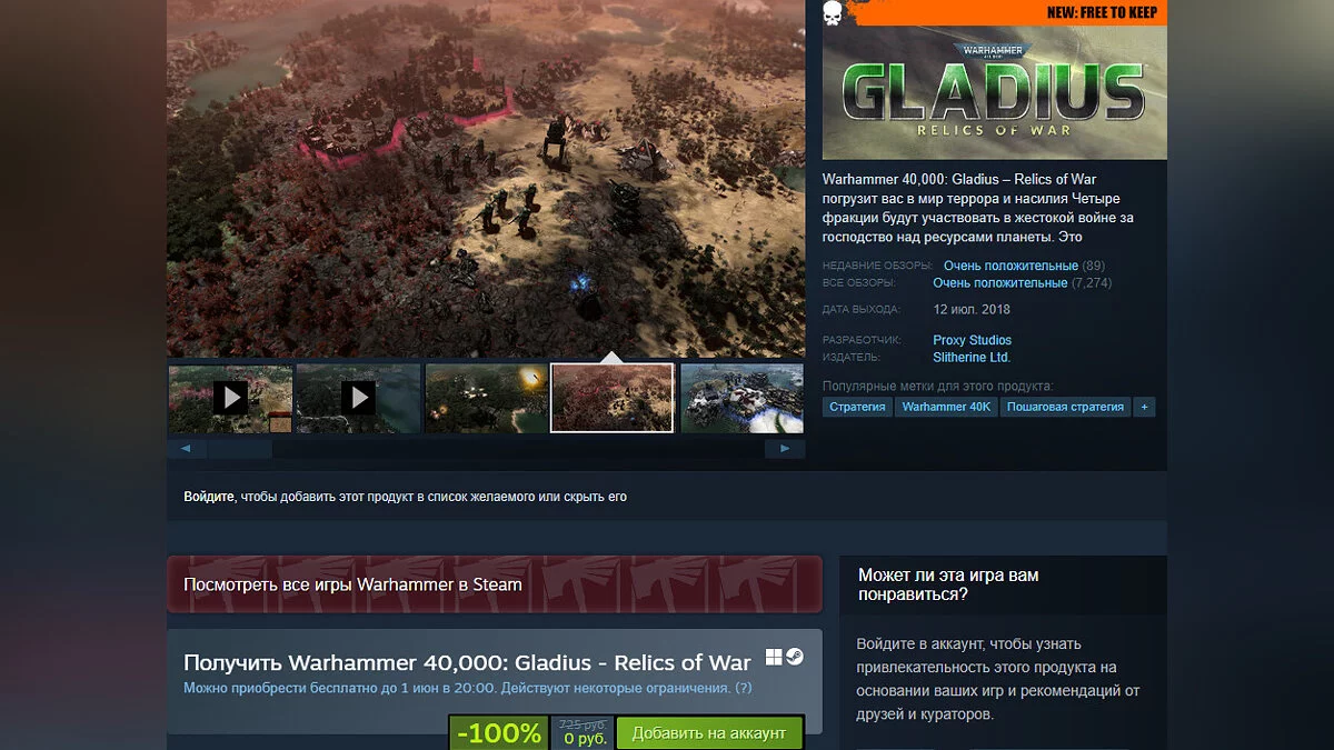 Подарок на 725 рублей: в российском Steam бесплатно раздают ПК-эксклюзив во вселенной Warhammer 40K с рейтингом 80%