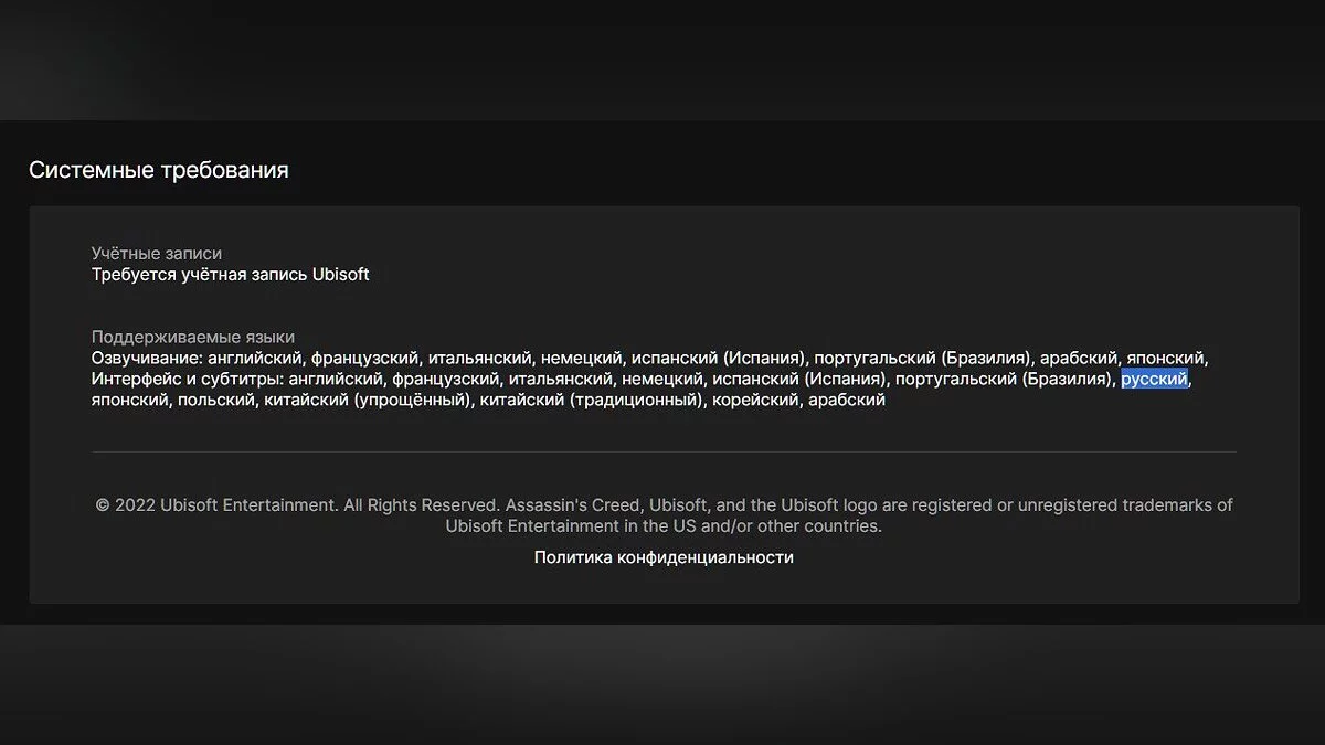 Пользователи сети узнали, что Assassin's Creed Mirage будет официально переведена на русский. Упоминание локализации нашли на странице игры в Epic Games Store.