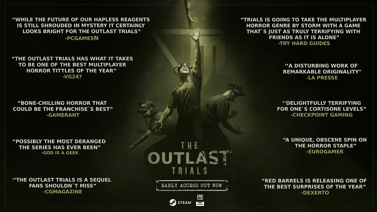 Студия Red Barrel сообщила об успешном релизе The Outlast Trials. За первую неделю после выхода в раннем доступе Steam разработчики продали 500 тысяч копий. В своём сообщение она поблагодарила геймеров за поддержку и поделилась изображением с хвалебными цитатами из обзоров.