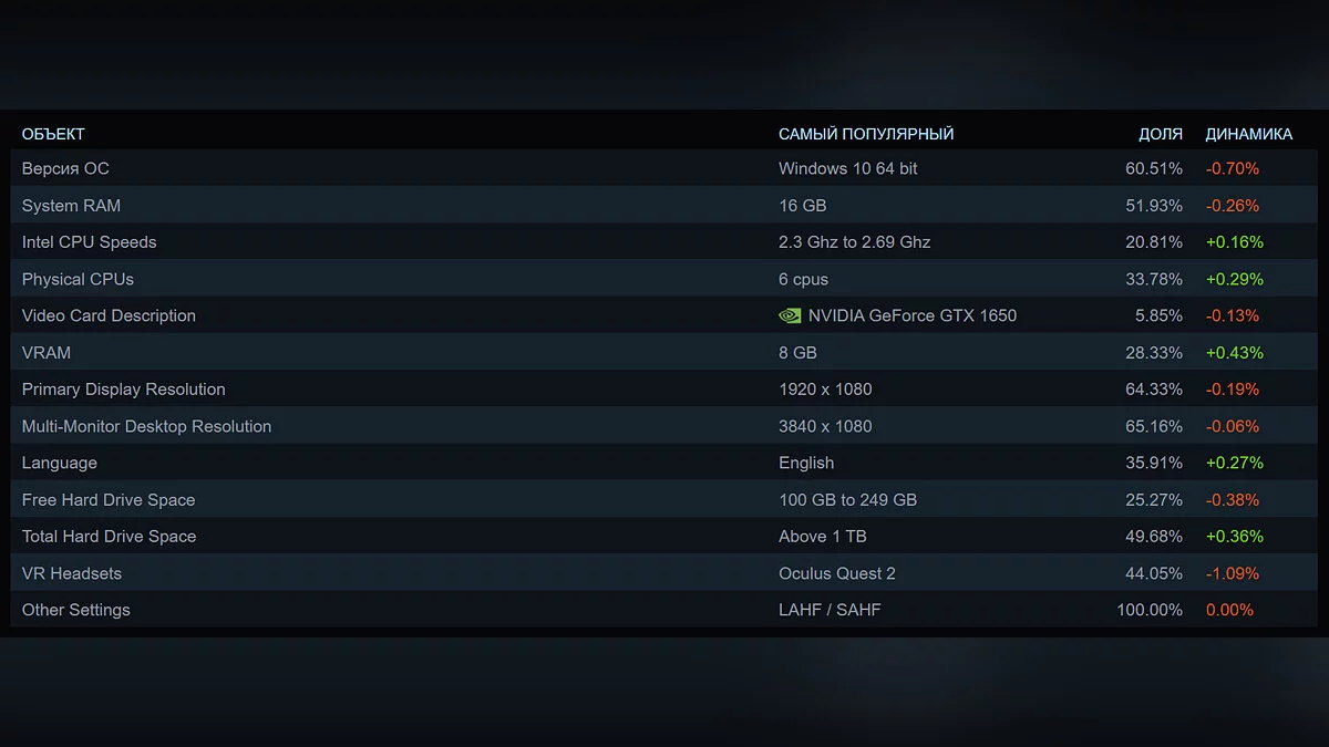Самой популярной видеокартой месяца снова стала NVIDIA GeForce GTX 1650 (5,85%). Следом идёт NVIDIA GeForce GTX 1060 (4,79%). Что касается остального «железа», то компьютеры большинства игроков оснащены 16 Гб оперативной памяти, 6-ядерными процессорами и мониторами с разрешением 1920x1080. Наиболее популярным шлемом виртуальной реальности оказался Oculus Quest 2 (44,05%). На втором месте расположился Valve Index (17,83%).