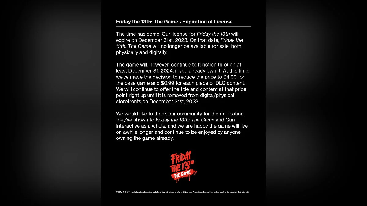 Мультиплеерный хоррор по киносерии «Пятница, 13-е» под названием Friday the 13th: The Game скоро исчезнет из продажи. 31 декабря игру уберу из всех цифровых сервисов, включая Steam. У разработчиков истёк срок лицензии, а продлевать её по неизвестной причине не стали.