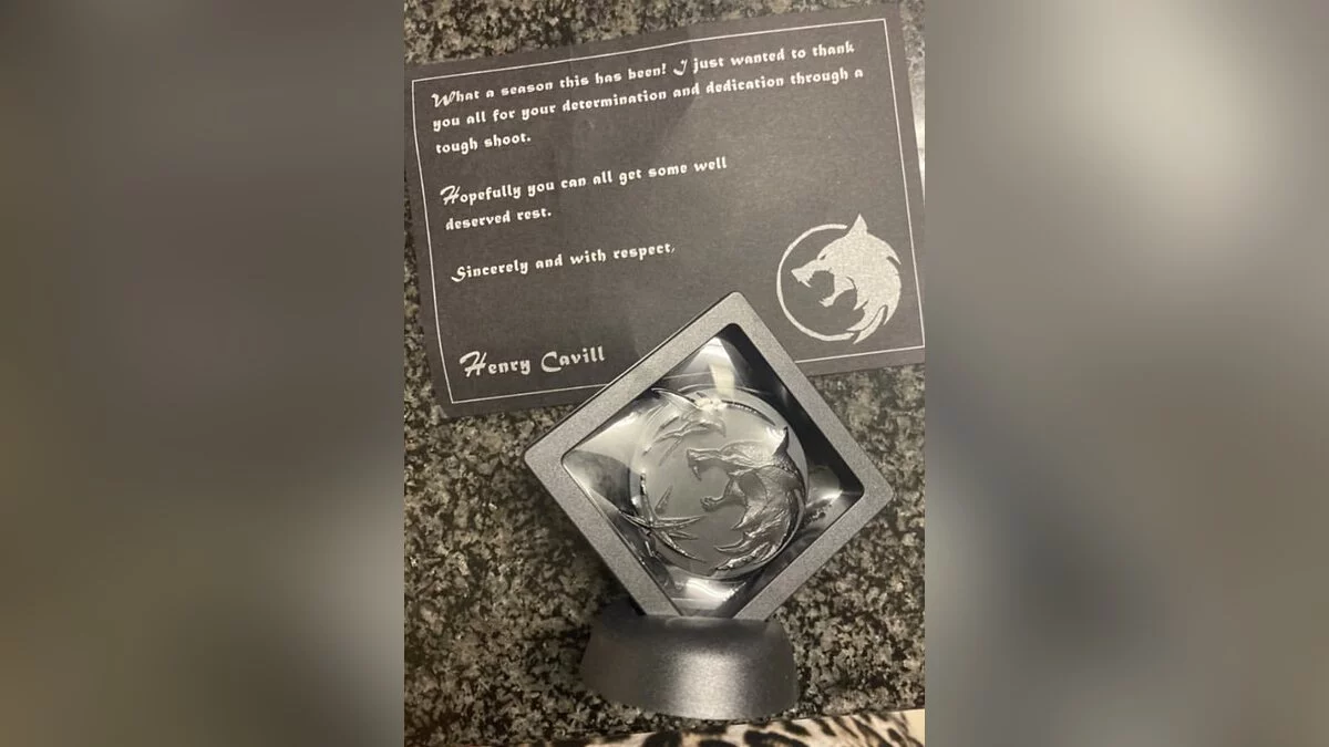 Заодно портал опубликовал фотографию металлического значка, который Генри Кавилл (Henry Cavill) подарил членам съемочной команды. С подарком шла небольшая открытка с благодарностями.