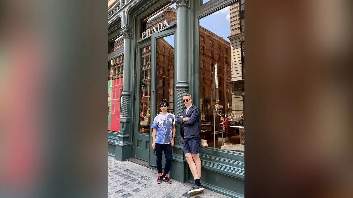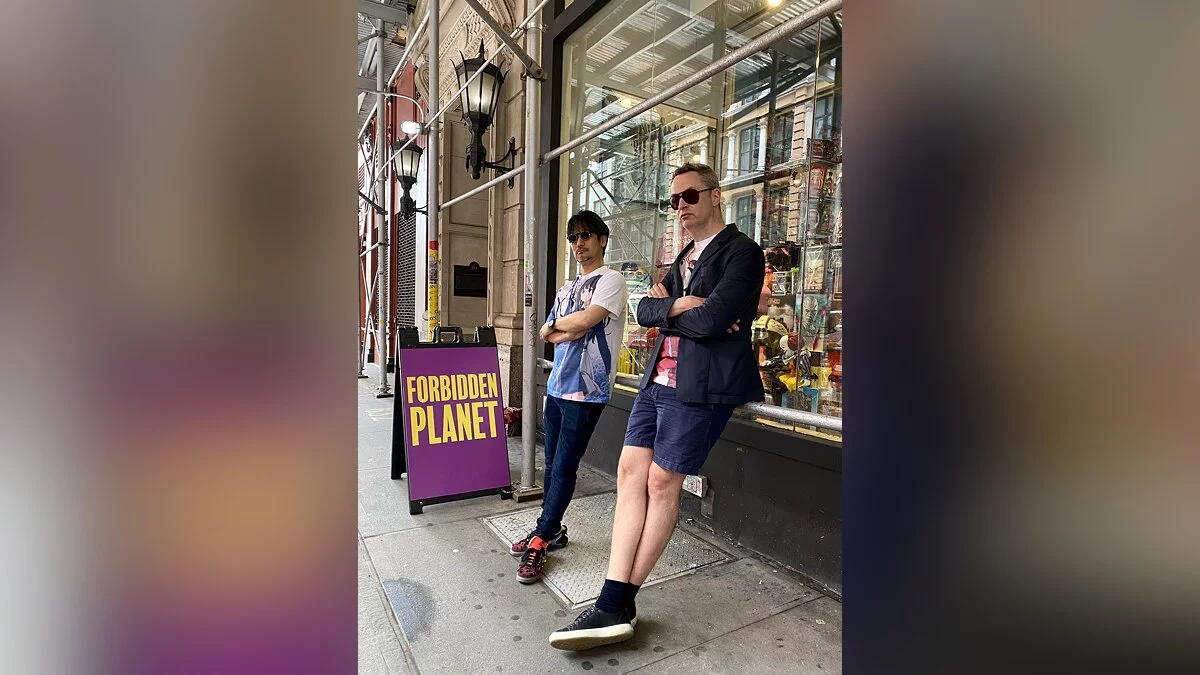 На фото Кодзима и Рефн, одетые в похожие футболки с анимешными героинями, путешествуют по городским улицам, посещая различные заведения.