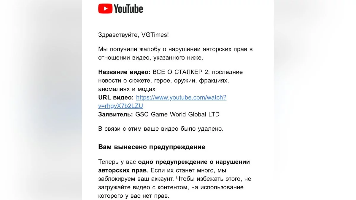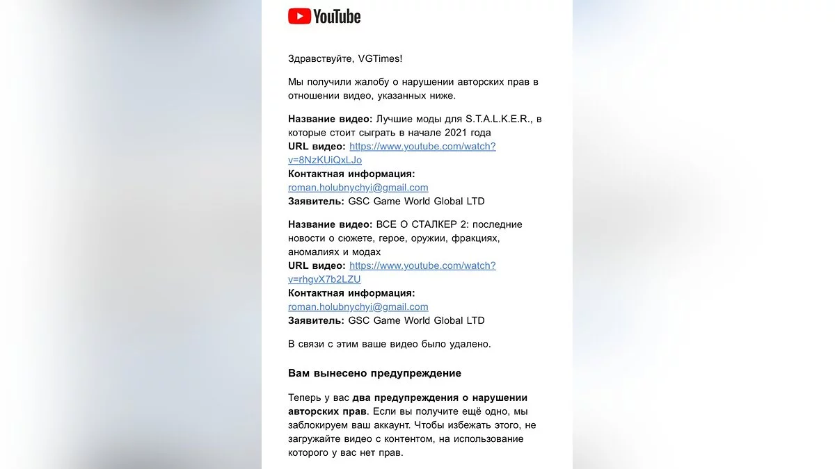 YouTube-канал VGTimes получил сразу два страйка о нарушении авторских прав. Жалобы касались двух роликов по серии S.T.A.L.K.E.R. — с рассказами про лучшие моды и новостями про вторую часть.