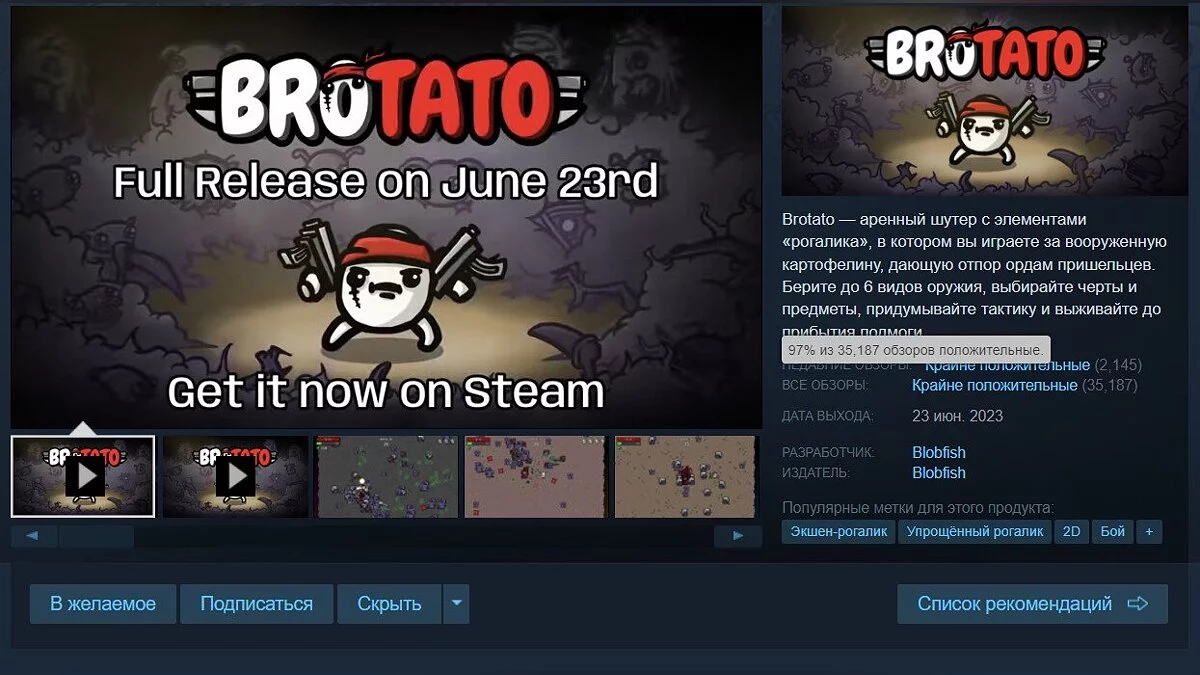 На момент написания новости рейтинг Brotato составляет 97%. Сейчас это одна из самых высокооцененных игр этого года в Steam.