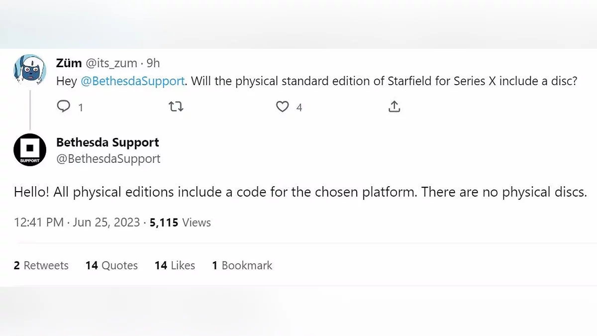 В физических изданиях Starfield не будет дисков. Об этом сообщили сами разработчики в Twitter, ответив на вопрос одного из фанатов. В коробках будет находится код активации. Спустя некоторое время сообщение разработчиков было удалено, однако пользователи успели сделать скриншот.