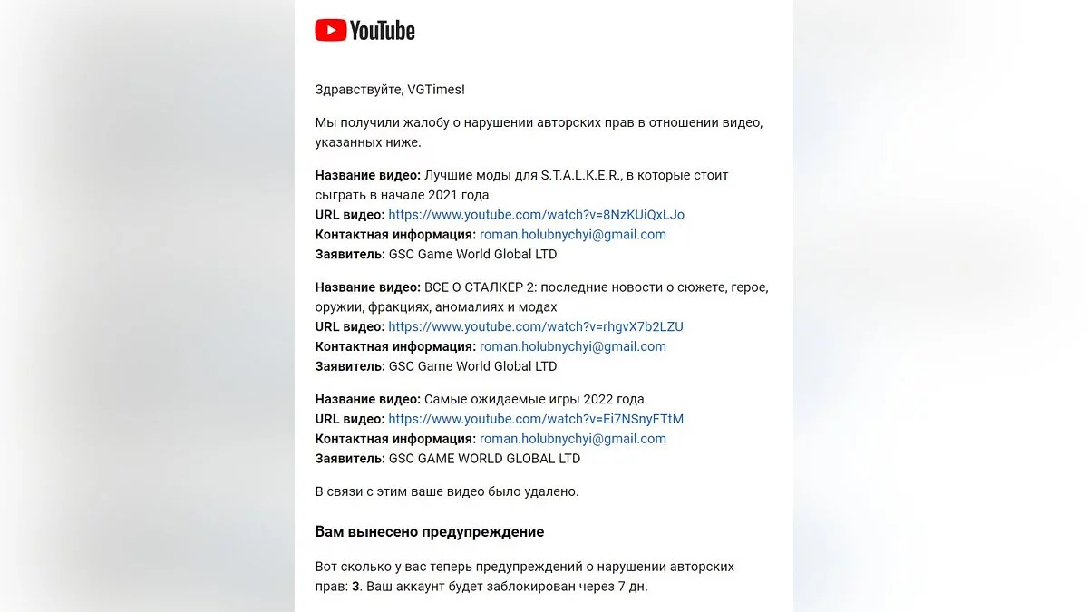 - Неактивный YouTube-канал VGTimes получил сразу 2 страйка за старые видео по S.T.A.L.K.E.R. (обновлено)