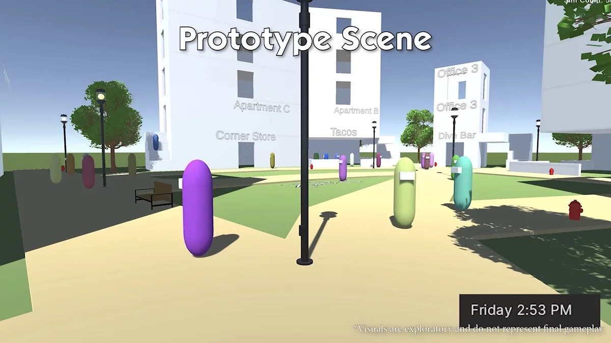 Сейчас готов лишь ранний прототип, поэтому иногда вместо нормальных симов по улицам ходят бобы из Among Us.