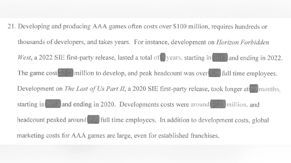 Согласно документу, разработка Horizon Forbidden West началась в 2017 году и стоила 212 млн долларов. Над игрой работала команда из 300 человек. The Last of Us: Part 2 стоила 220 млн долларов и потребовала участия 200 сотрудников.