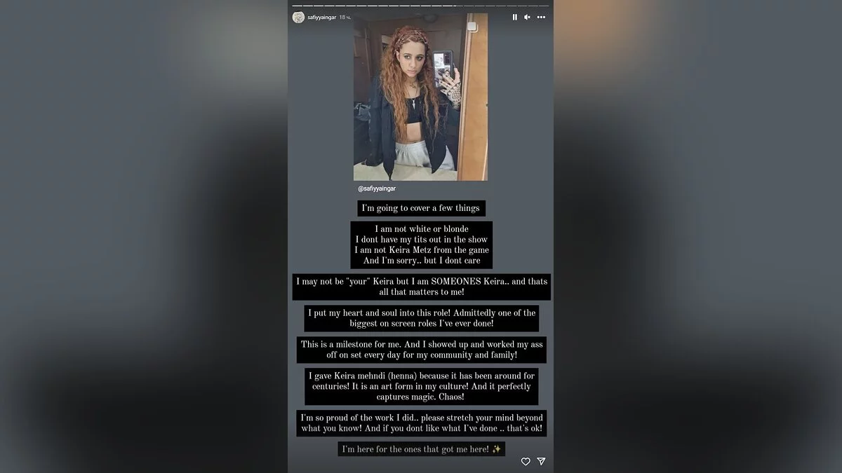 Сафийе Ингар отреагировала на критику, опубликовав сторис у себя в Instagram*. Актриса заявила, что гордится свой интерпретацией Кейры Мец, и поблагодарила всех, кто ее поддерживает.