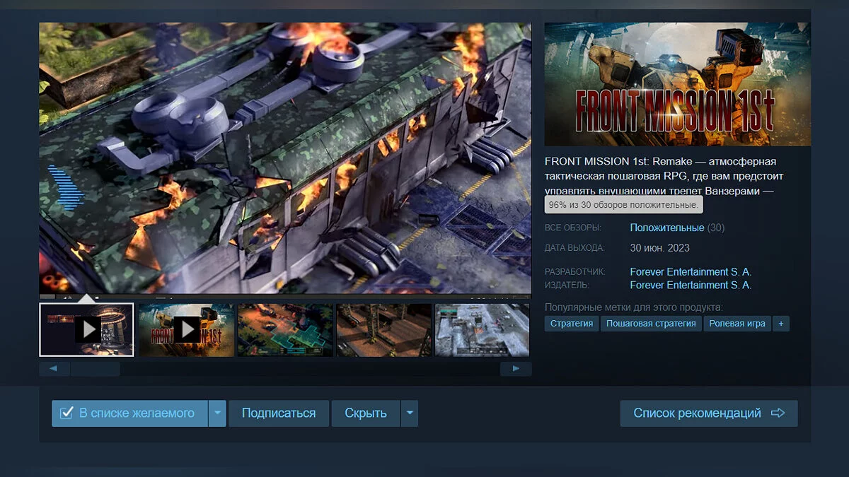 Купить Front Mission 1st: Remake можно в Steam за 1080 руб (с учетом скидки 10%, которая действует до 14 июля). Игра также продается в GOG, Epic Games Store, PS Store и Xbox Store. Стоит заметить, что на Nintendo Switch она вышла еще в ноябре 2022 года.