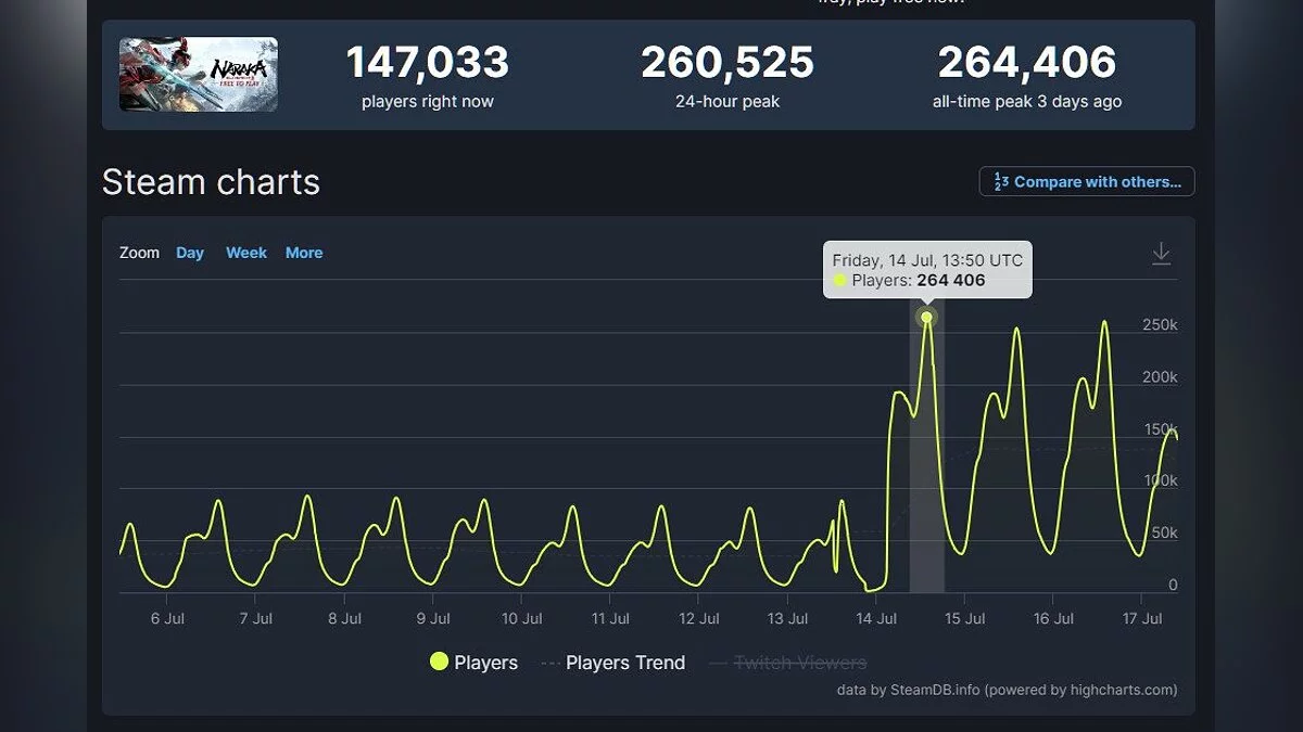 По данным сервиса SteamDB, 14 июля в игре одновременно находилось 264 тысячи человек. До перехода на условно-бесплатную модель ежедневный пиковый онлайн составлял около 80 тысяч.