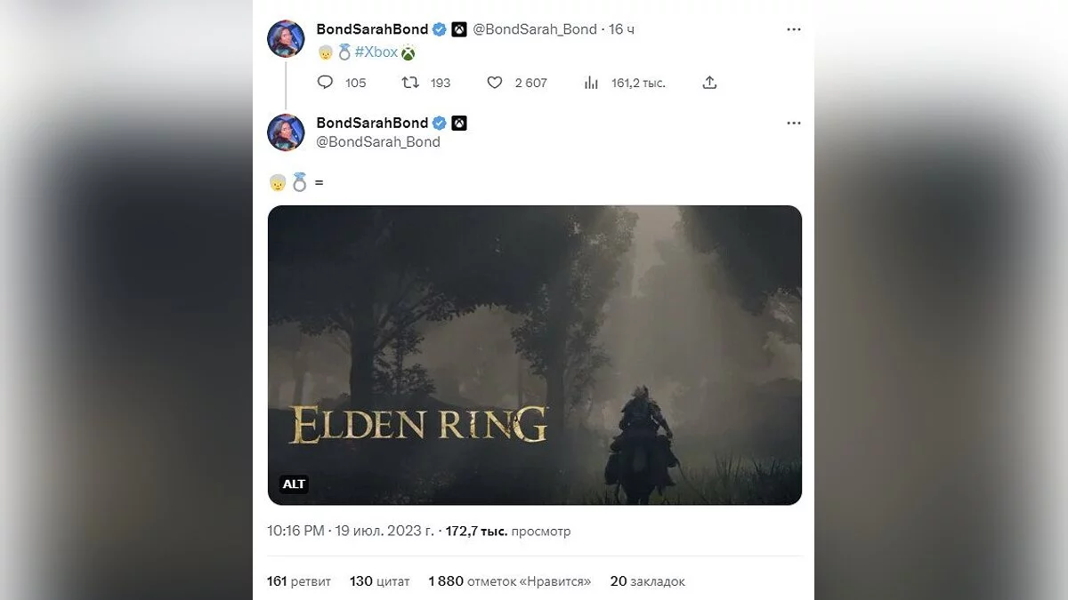 Elden Ring появится в Game Pass? Именно об этом думают подписчики Сары Бонд (Sarah Bond), корпоративного вице-президента Xbox. Топ-менеджер опубликовала в Twitter послание, состоящее из эмодзи пожилого человека, кольца и логотипа Xbox.