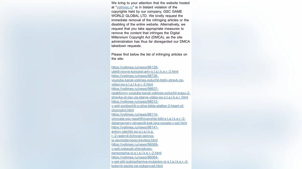 В качестве «нарушающего авторские права GSC контента» Роман Голубничий указал новости и статьи, в которых мы рассказывали про утечку S.T.A.L.K.E.R. 2 (в них нет слитых кадров и ссылок на билд) и страйки на YouTube-канал.