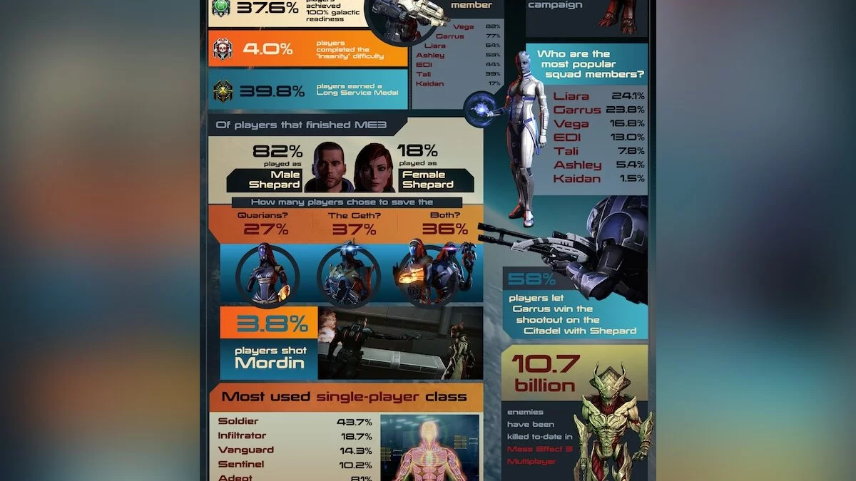 Разработчики также опубликовали статистику одиночной кампании Mass Effect 3. С инфографикой вы можете ознакомиться ниже, а мы озвучим лишь главные цифры:
