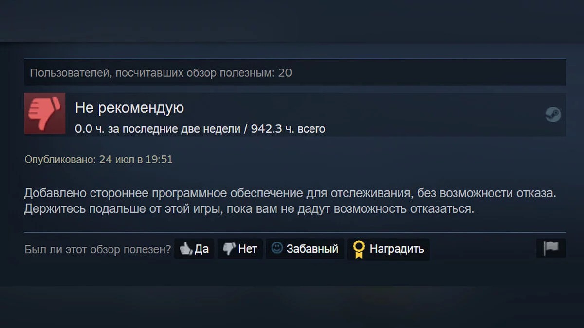 В итоге игроки забросали проект отрицательными отзывами. Разработчики уже извинились перед геймерами и оперативно выпустили хотфикс, который удалил шпионское ПО и всю собранную им информацию, а также вернул прошлую версию лицензионного соглашения.
