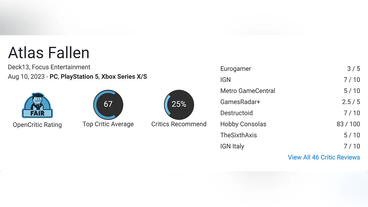 За день до релиза Atlas Fallen спало эмбарго на публикацию обзоров. Ролевой экшен не смог впечатлить критиков — его средний балл на OpenCritic составил всего 67/100. На Metacritic оценка игры оказалась ещё ниже — 64/100 баллов (версия для PlayStation 5).