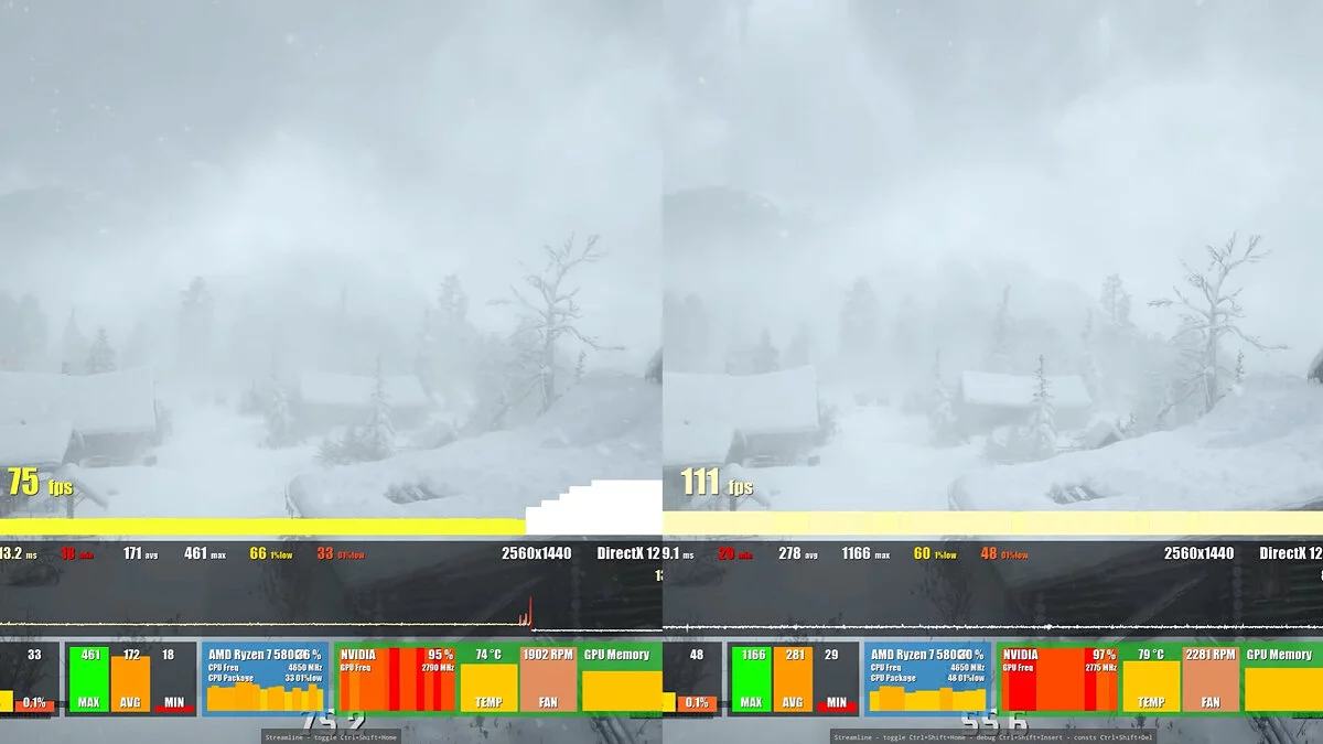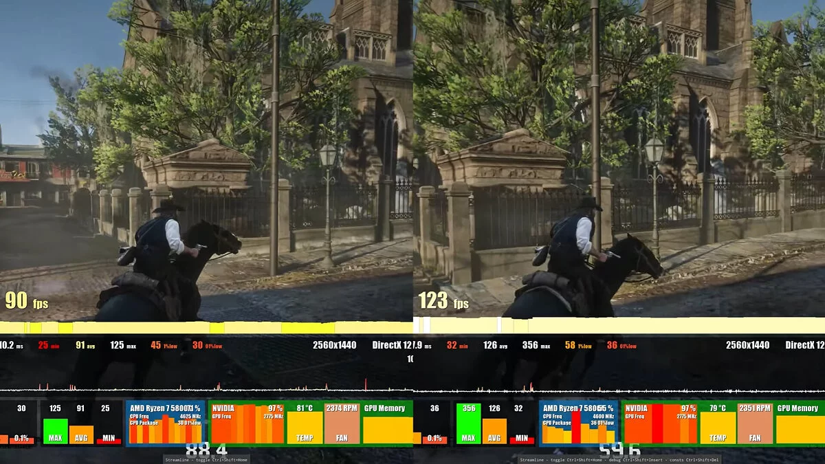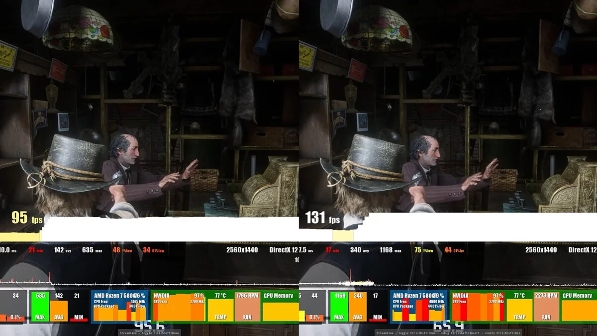 В ролике автор сравнил модифицированную версию Red Dead Redemption 2 с оригиналом. Результаты (количество FPS) можно увидеть на скриншотах ниже: