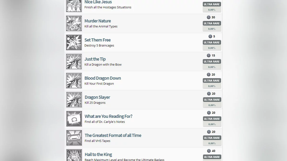 Всего за получение всех достижений насчитывается 400 игровых очков. Напомним, что это потолок для цифровых релизов в сервисе Xbox LIVE Arcade. Исходя из этого, можно предположить, что Far Cry 3: Blood Dragon — это, скорее, самостоятельная игра, чем обычное дополнение. Сам список вы можете посмотреть ниже, но остерегайтесь спойлеров!