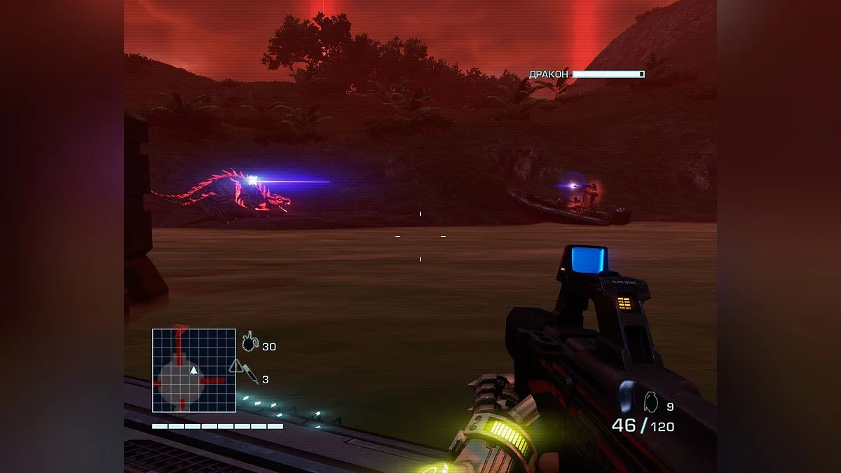 В захвате баз все же можно выделить одну особенность. По острову бродят драконы будущего, на крови которых и закручен сюжет. В качестве приманки можно использовать киберсердца, которые Рекс вырывает из своих врагов с очередным комментарием. Если у вас их достаточное количество, то дракона можно провести через пол-острова, заманить его на базу, а после гибели всех ее защитников выманить наружу.