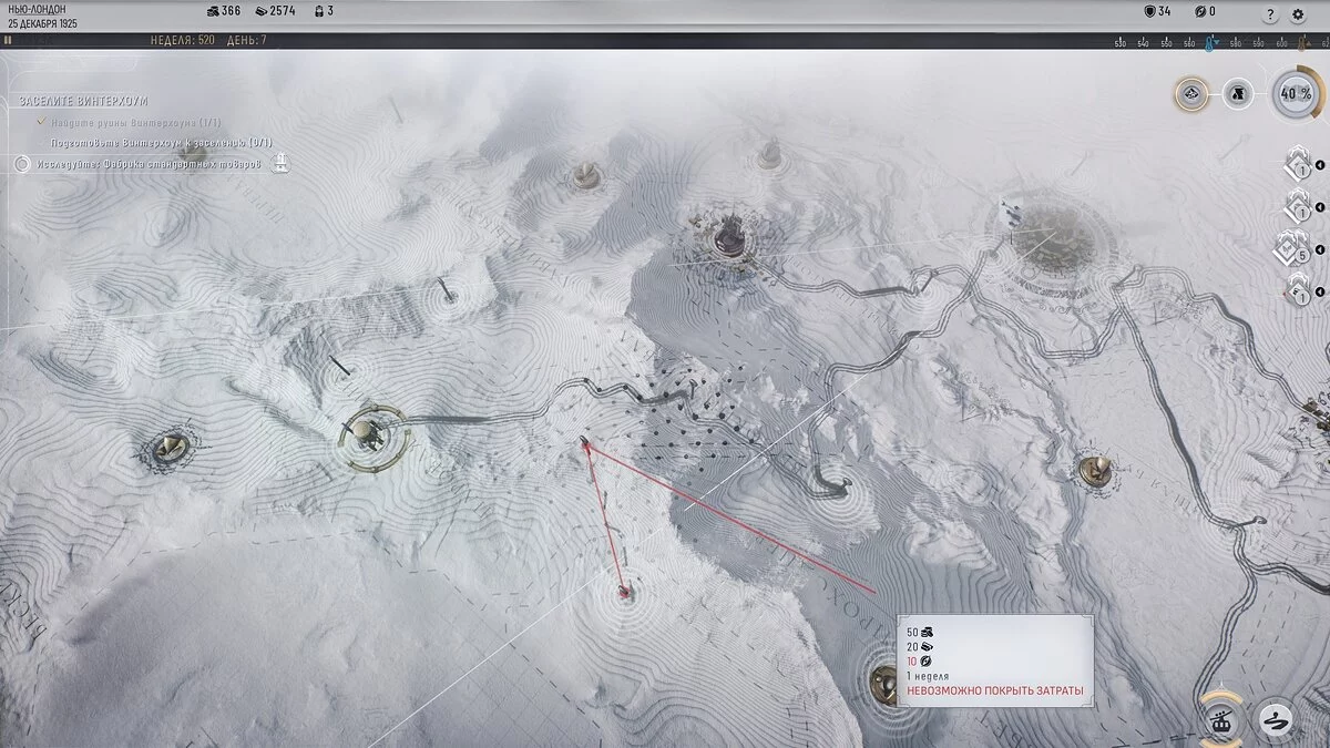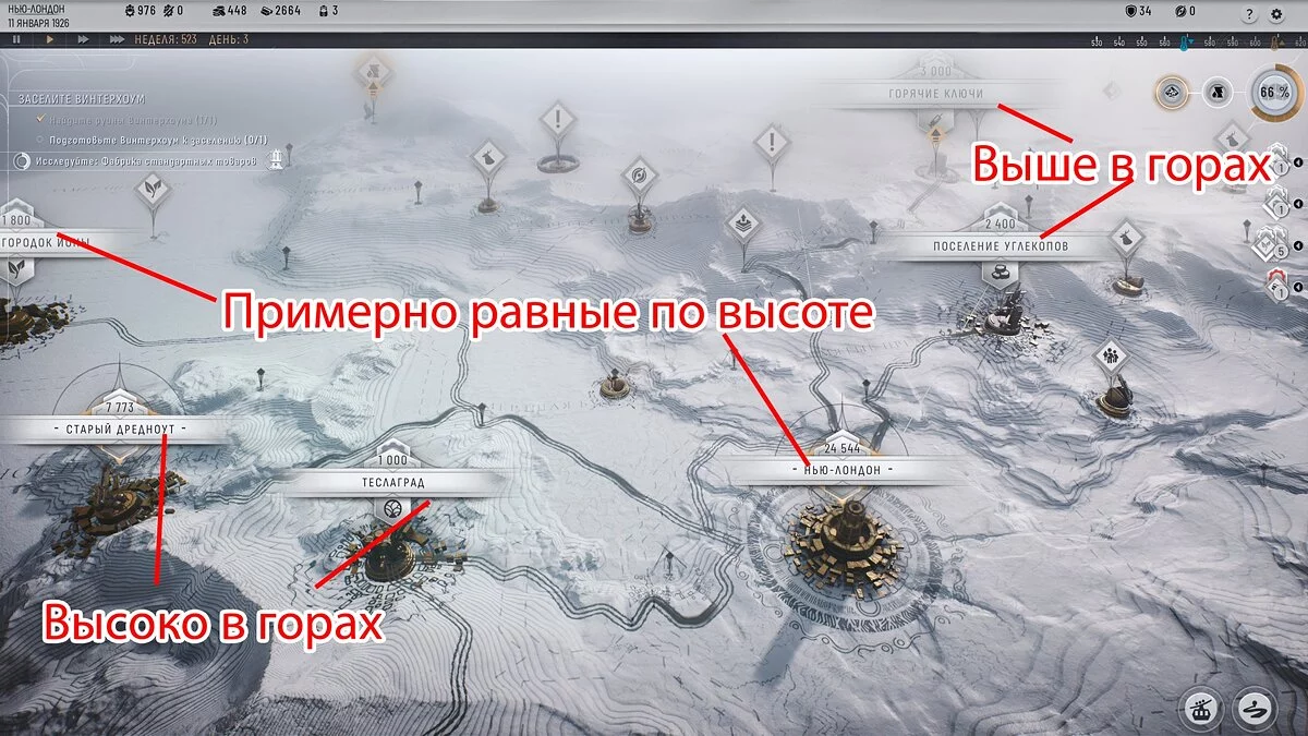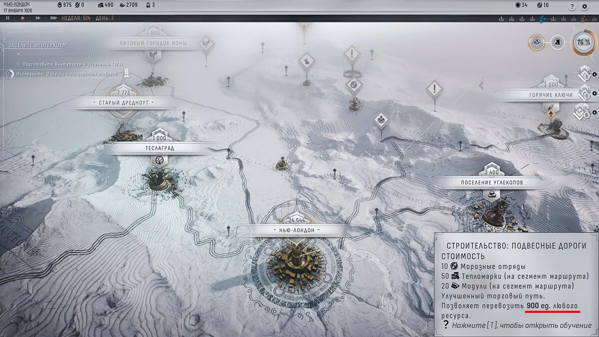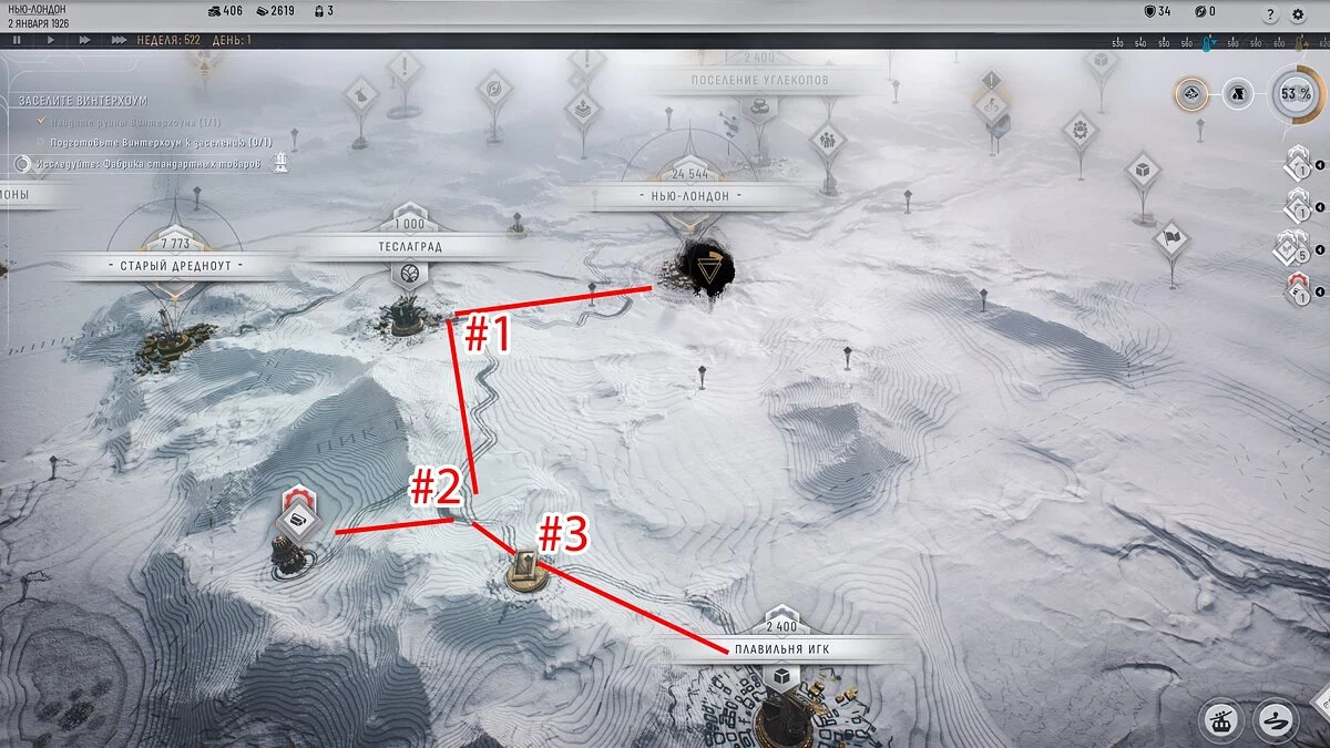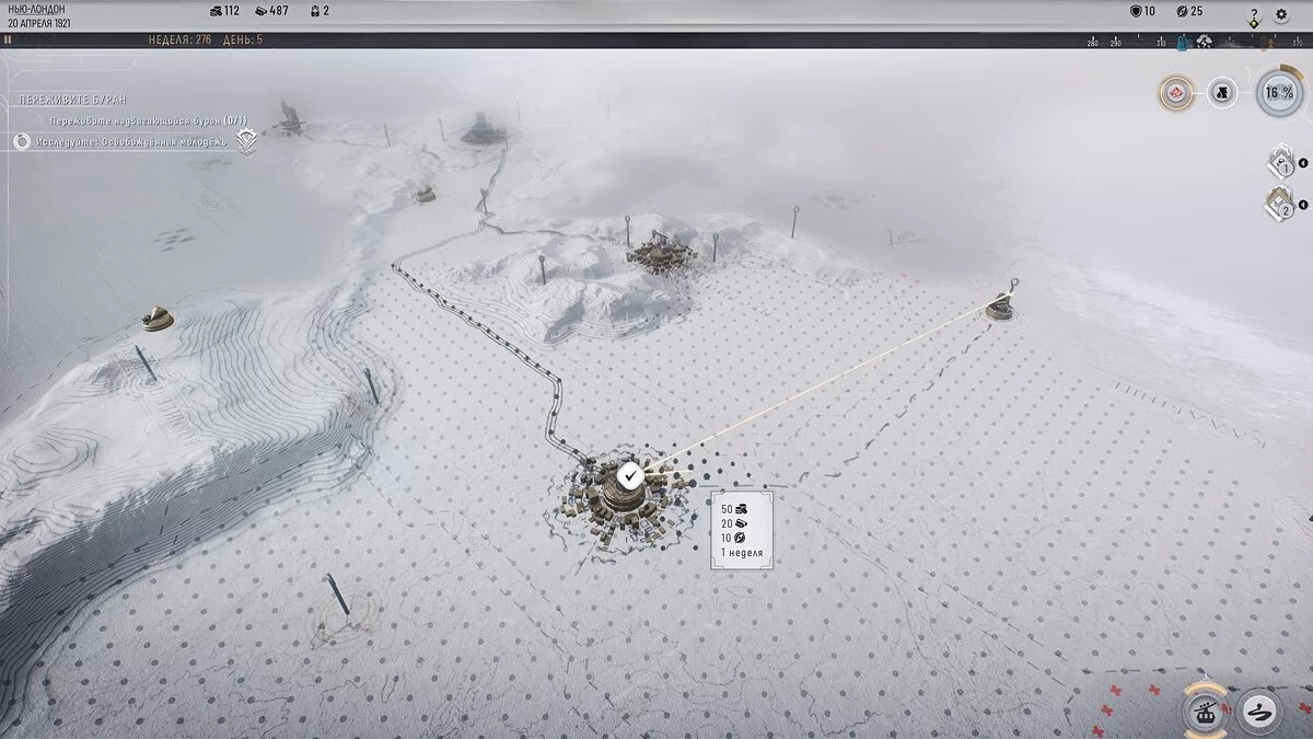 В отличие от оригинального Frostpunk, в сиквеле вы не можете напрямую проложить маршрут от города до желаемого места. Появилась новая механика высотных уровней (нормалей), что означает, что местность имеет разную высоту. Считайте условно, что Нью-Лондон расположен на высоте 1000 метров, а места интереса вокруг него — на разных уровнях, зачастую выше. Из-за чего построить прямой маршрут просто невозможно.
