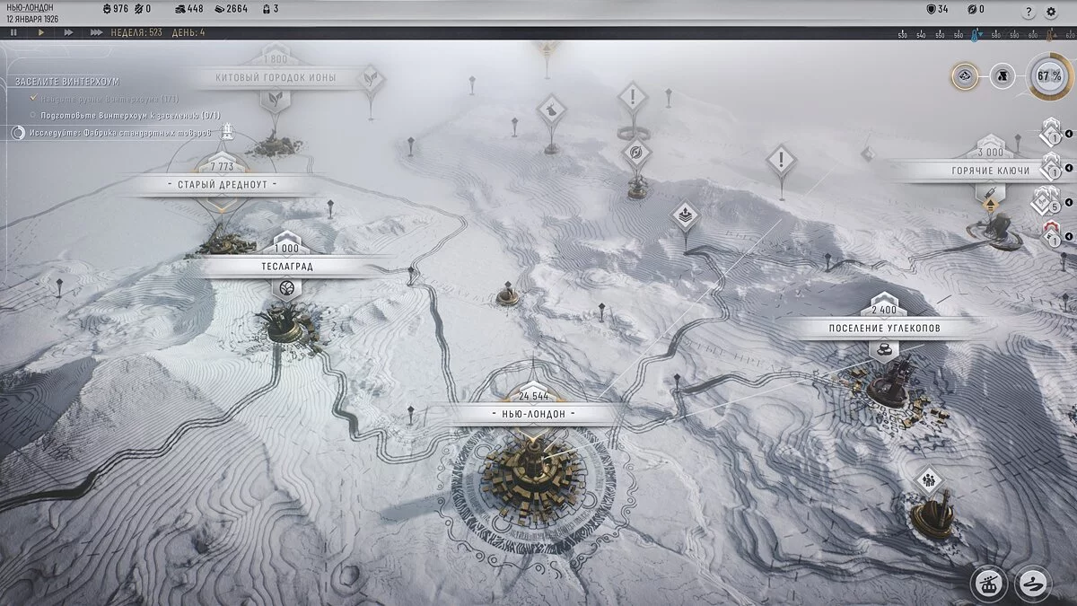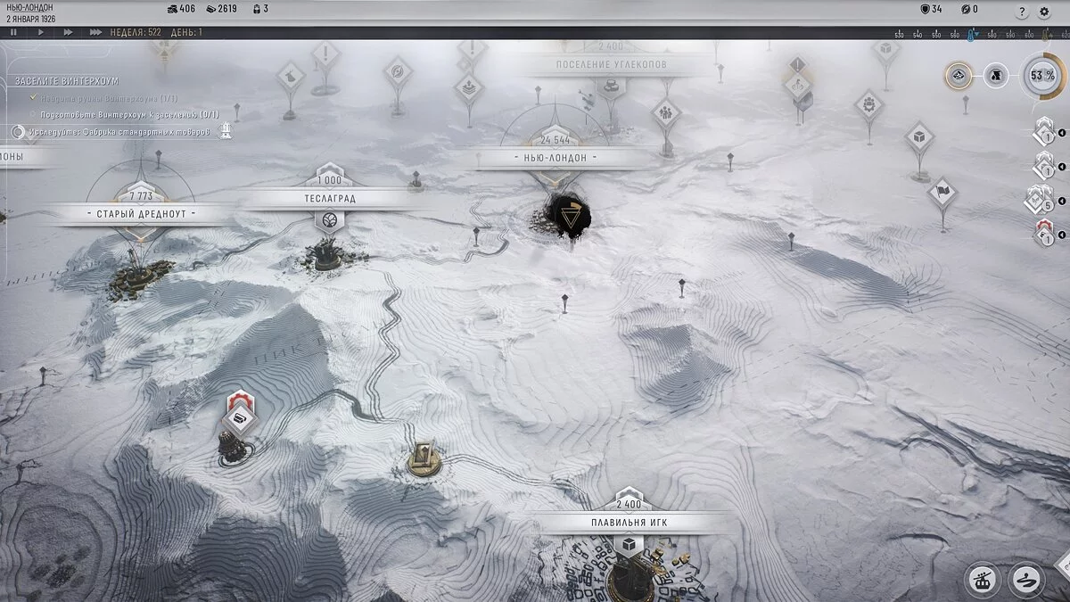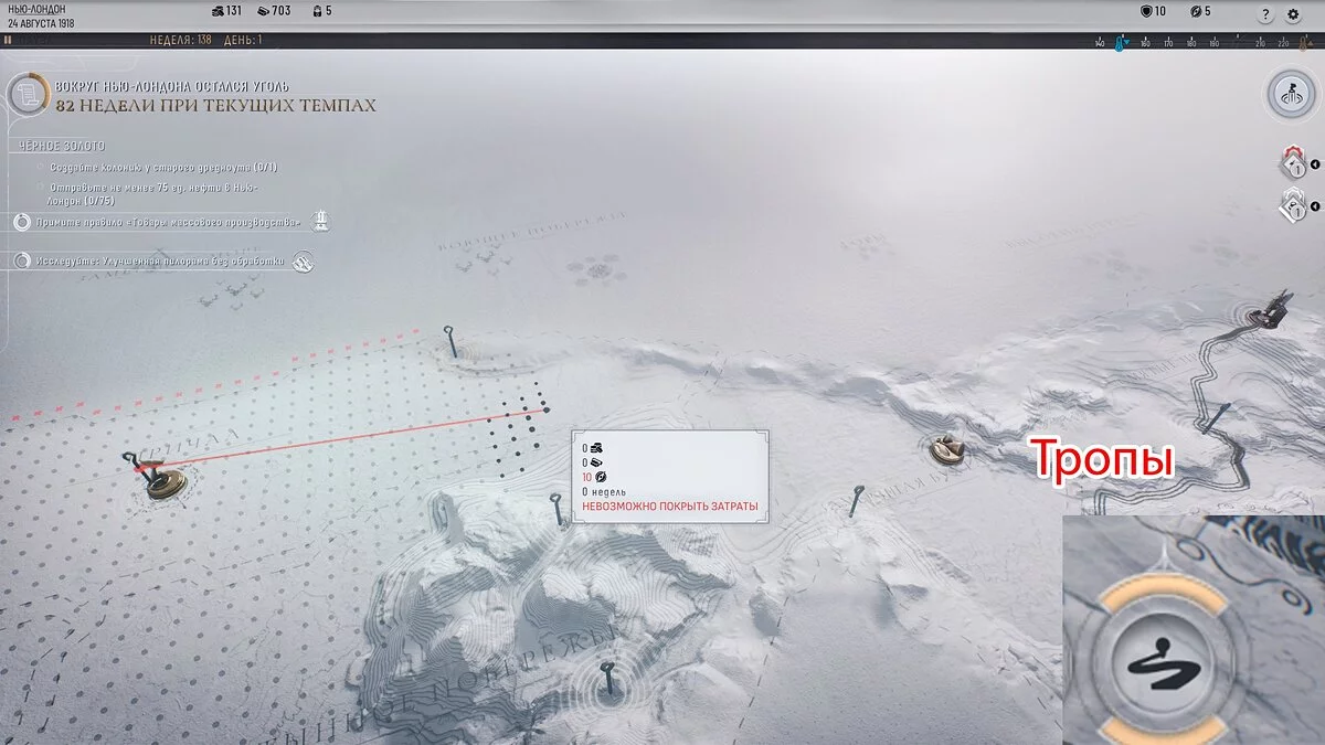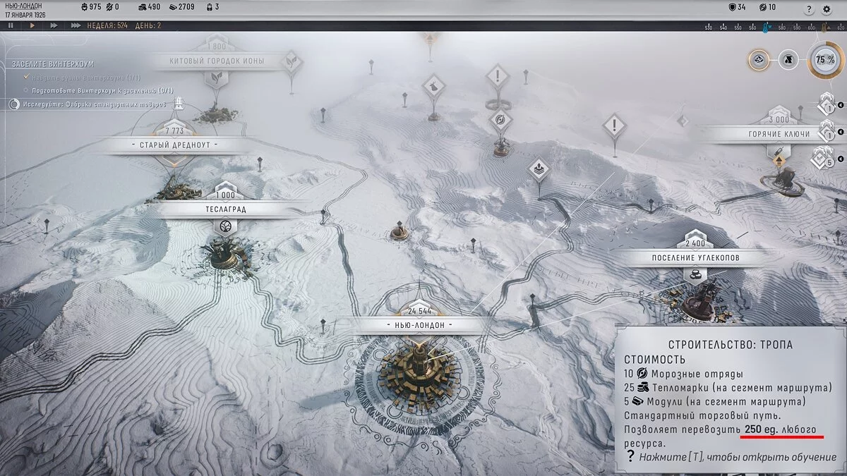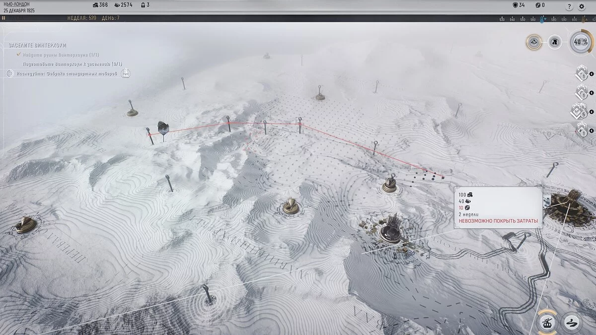 В отличие от оригинального Frostpunk, в сиквеле вы не можете напрямую проложить маршрут от города до желаемого места. Появилась новая механика высотных уровней (нормалей), что означает, что местность имеет разную высоту. Считайте условно, что Нью-Лондон расположен на высоте 1000 метров, а места интереса вокруг него — на разных уровнях, зачастую выше. Из-за чего построить прямой маршрут просто невозможно.