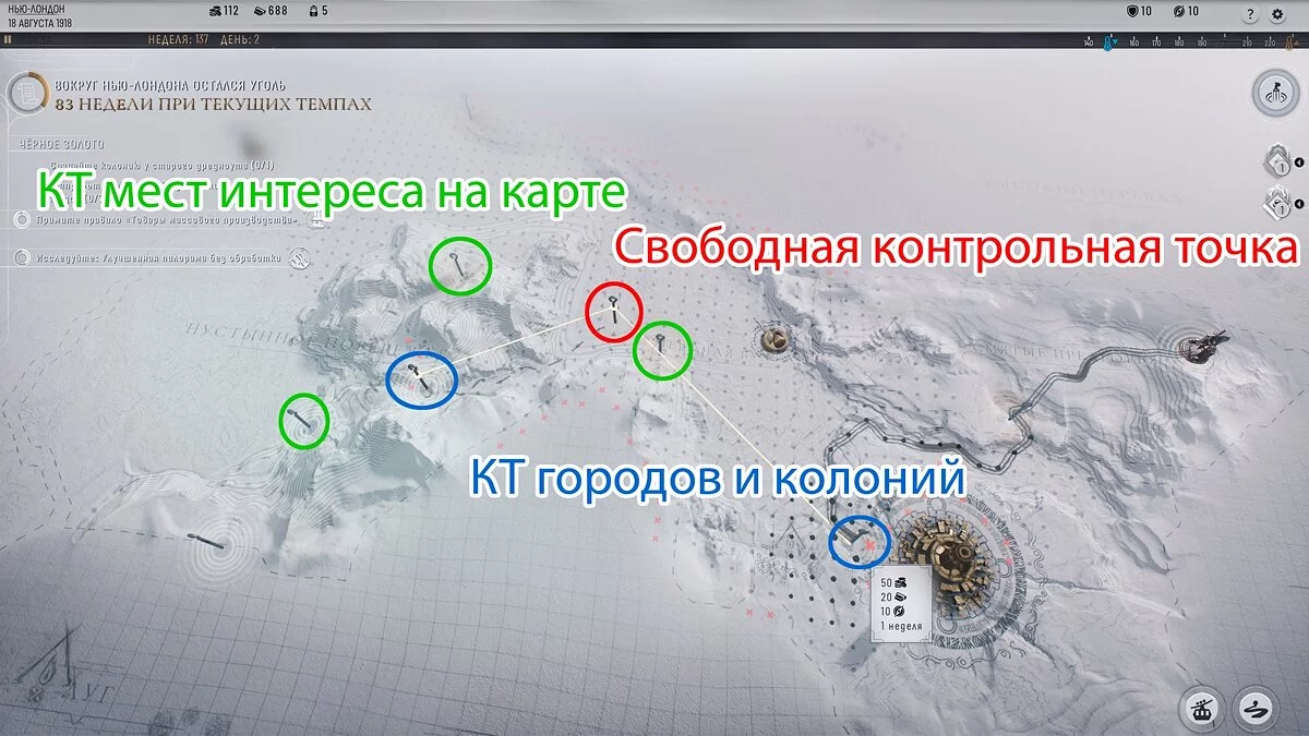 Вы можете «повесить» несколько маршрутов на одну КТ (прицепить дороги на одну «булавку»), и от неё в Нью-Лондон. Все ресурсы будут поставляться одновременно. Игра предусматривает транспортировку из аванпоста или поселения либо в город, либо в колонию.