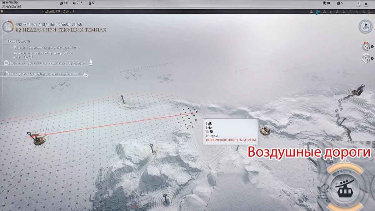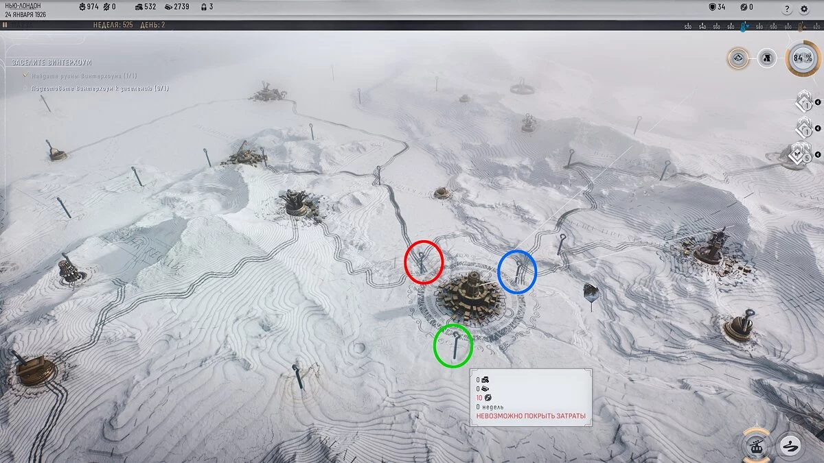 Чтобы ледовый крюк появился на глобальной карте, нужно сначала построить логистический район на тактической карте. Место постройки на тактической карте определяет местоположение крюка на стратегической карте — выделено на скриншотах цветов. Первый логистический район лучше разместить на востоке, так как это направление наиболее важно в начале игры, а затем можно развивать другие стороны.