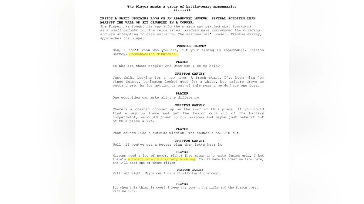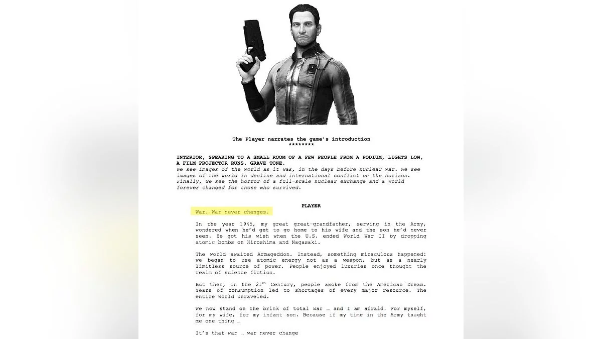 В представленных документах содержаться диалоги и описания локаций. Конечно, любой диалог может быть изменен к моменту выхода игры, но они достаточно интересны. В первую очередь, своим начальным роликом. Впервые в серии главный герой начнет диалог, и он сделает это со слов «Война. Война никогда не меняется».