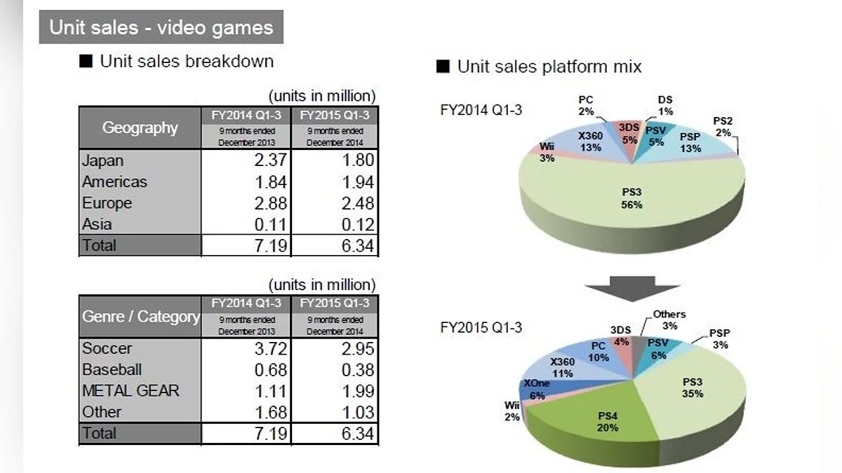 Виной тому просевшие показатели спортивных и других игр японской компании, а вот серия Metal Gear демонстрирует рост. Нельзя сбрасывать со счетов тот факт, что люди в Японии и Европе покупают меньше, в то время как Азия и Америка демонстрируют рост.