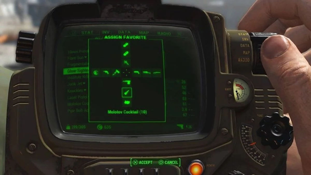 Еще три слота задействуйте для самых часто используемых вами типов оружия, еще слот или два отдайте под предпочитаемые взрывчатые устройства (мины, гранаты или коктейли Молотова), а оставшиеся распределите согласно личным предпочтениям, например, под оружие ближнего боя. Так вы сможете оставаться крайне мобильным во время боя и не отвлекаться на поиск чего-то в Pip-Boy.