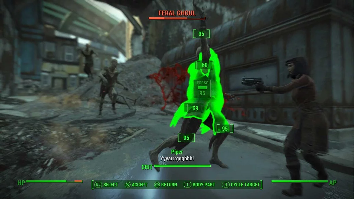Как вы уже, наверное, знаете, V.A.T.S. не ставит игру на паузу, он просто замедляет время на несколько секунд, чтобы вы могли выстрелить в наиболее уязвимую часть тела врага (выделена в процентах). Поэтому учитывайте, что по вам все еще могут попасть рейдеры, а гули могут дотянуться в рукопашной, если подобрались достаточно близко.