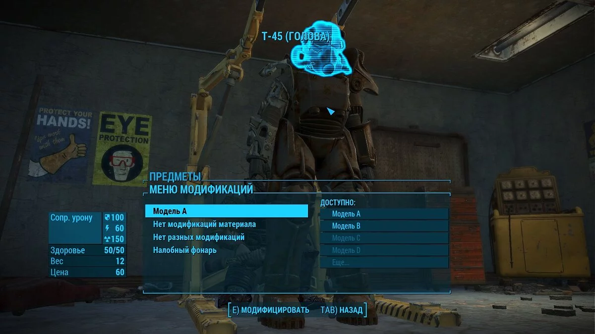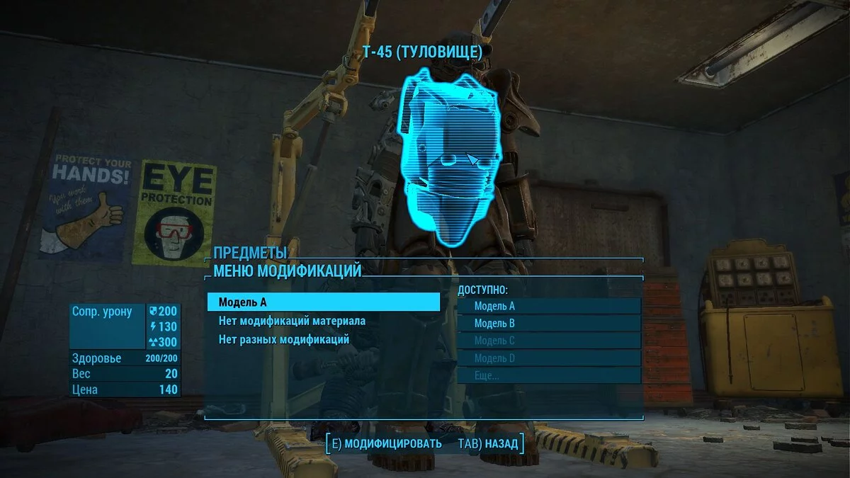 После этого вы можете посмотреть на доступные модификации для каждого из шести элементов силовой брони. Можно изменить как основную модель, A, B, C, D, E, F: