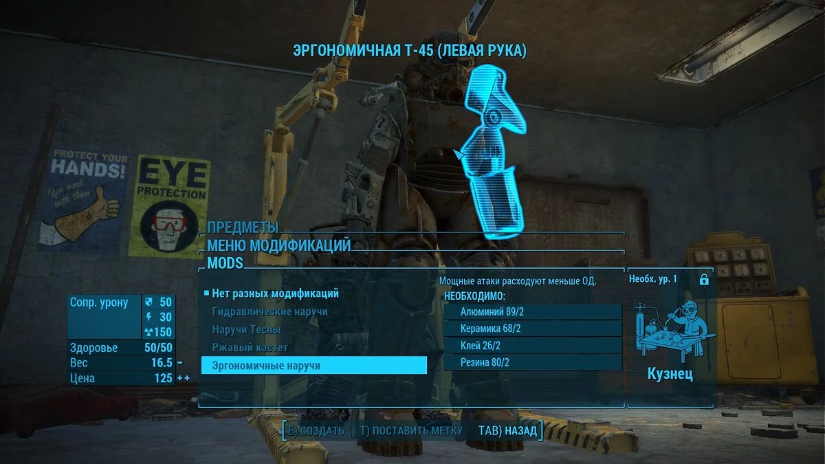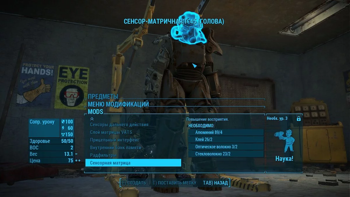 Для проведения модификаций необходим отдельный станок — «Станция обслуживания брони», которую можно найти на стоянке грузовиков «Красная ракета» и в «Сэнкчуари Хиллз». Вам необходимо поставить свою силовую броню прямо в станок, а затем уже открыть меню взаимодействия.
