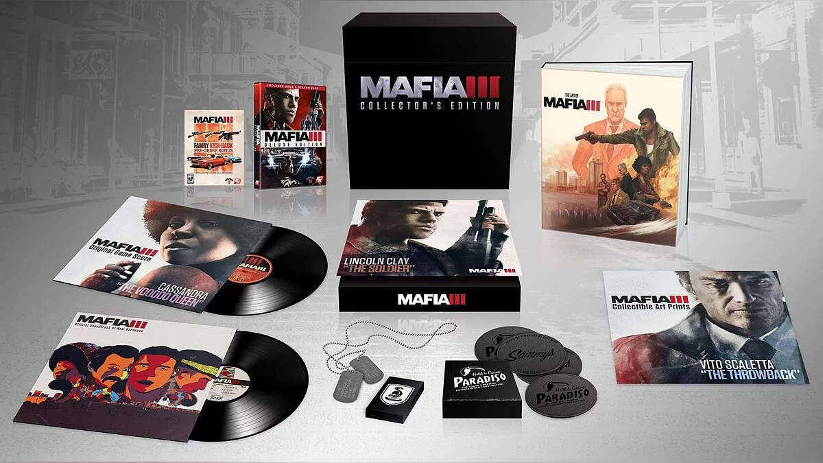 Так или иначе, коллекционное издание Mafia 3 обойдется без дорогущих фигурок. Вместо этого в него войдут: две виниловые пластинки с лицензированным и оригинальным саундтреками, две литографии от Playboy и Альберто Варгаса (Alberto Vargas), 56-страничный артбук в твердой обложке, реплика военных жетонов главного героя, подставки под горячительные напитки из кожзама с логотипами игрового казино Paradiso, код на сезонный пропуск и, собственно, диск с игрой в обычной коробке.