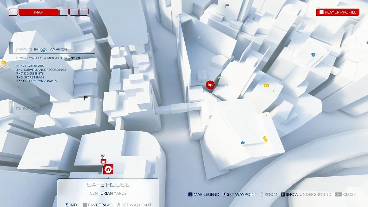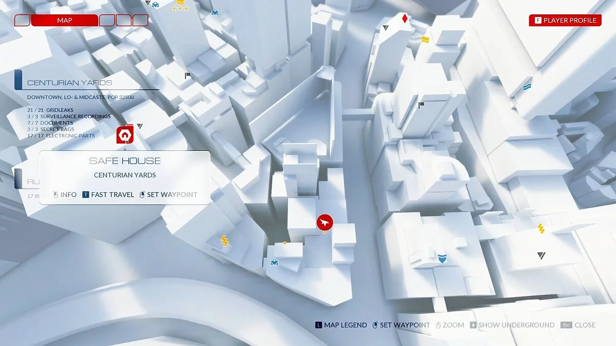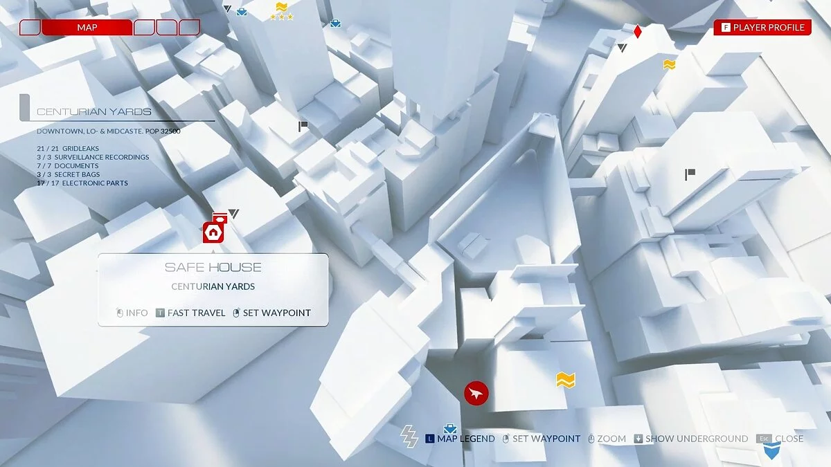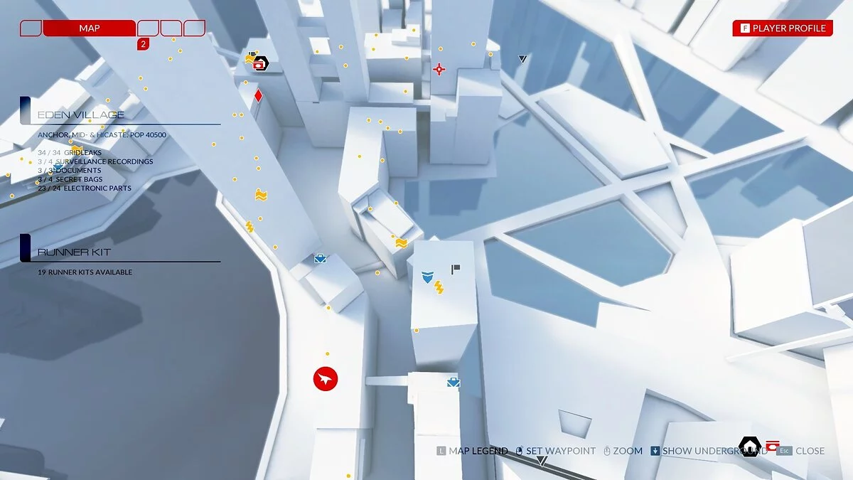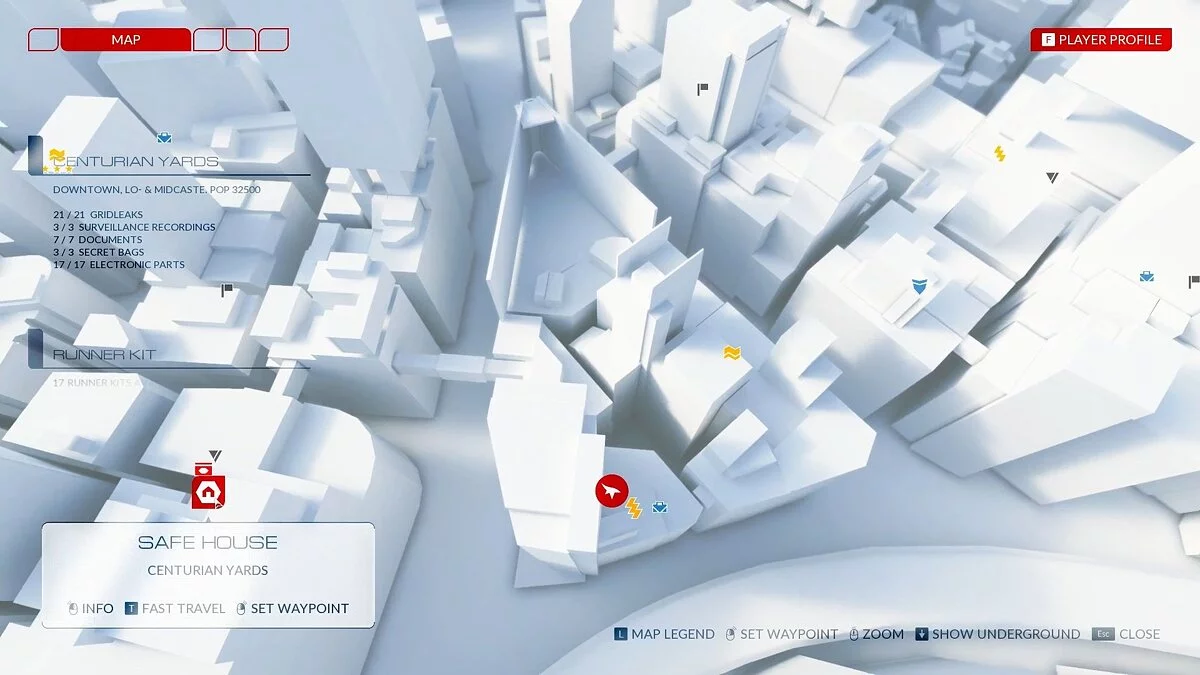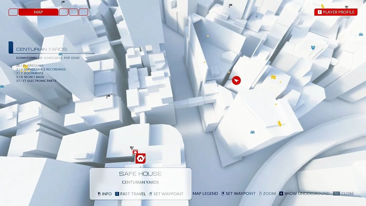 Имейте в виду, что некоторые документы, аудиозаписи и секретные сумки можно собрать, только внутри определенной сюжетной миссии. Вы можете проверить количество собираемых предметов в каждой миссии, открыв вкладку ЗАДАНИЕ в меню Mirror's Edge Catalyst. Не волнуйтесь, если что-то пропустите, так как каждую миссию можно перепройти, собрав все нужные для 100-процентного прохождения компоненты.