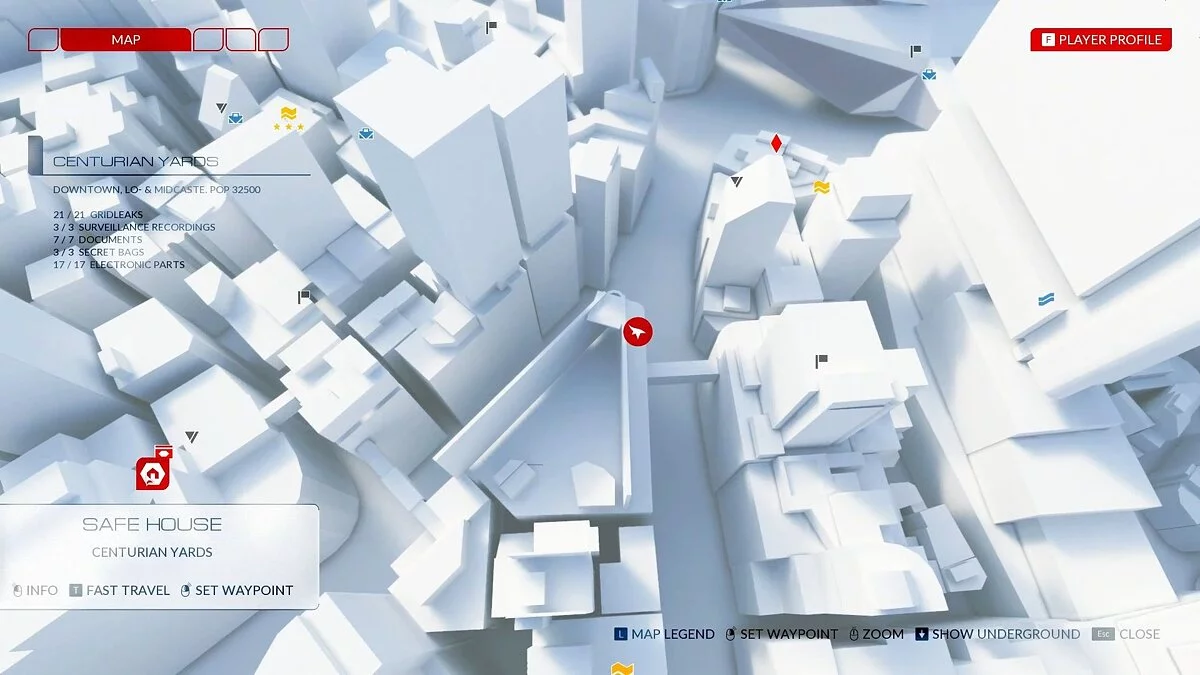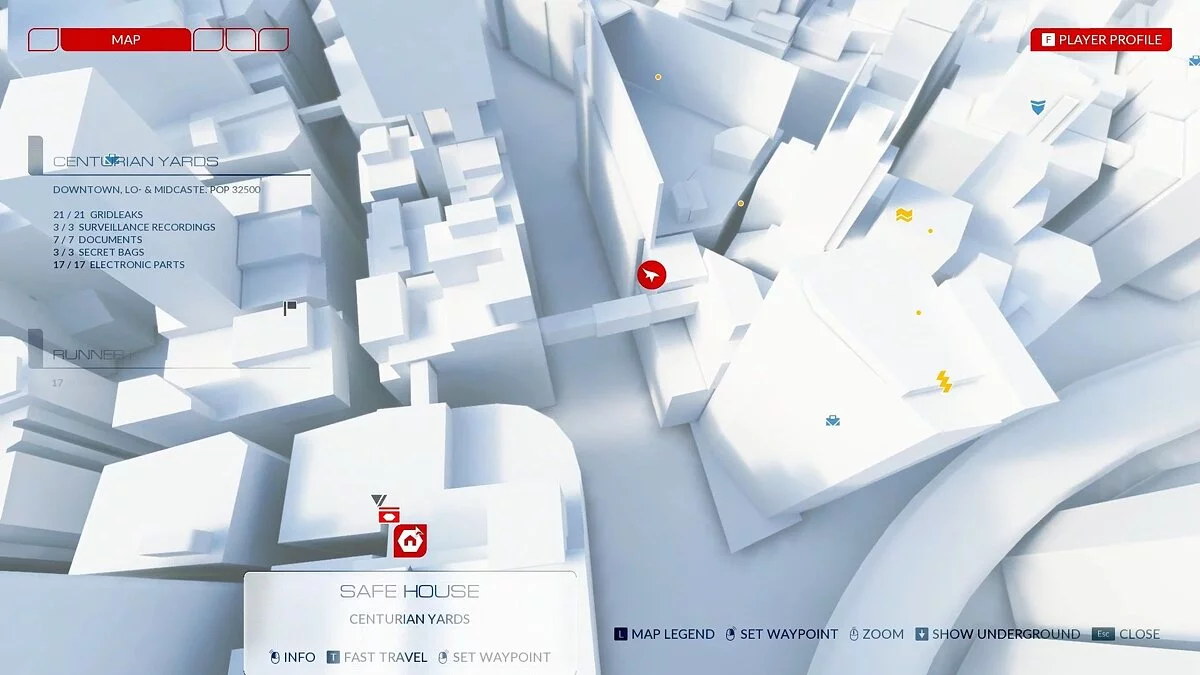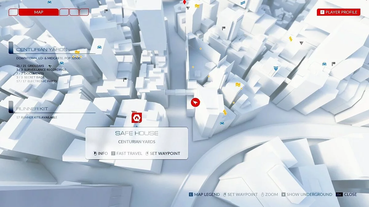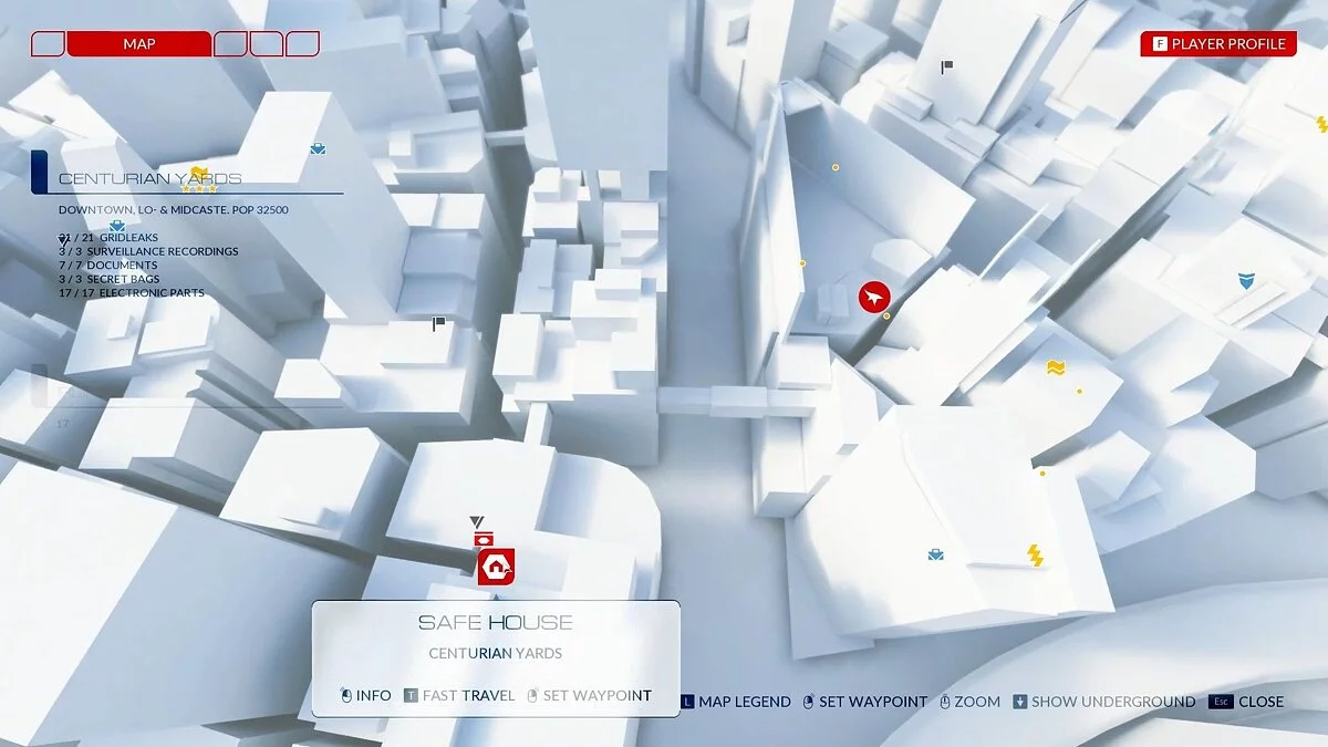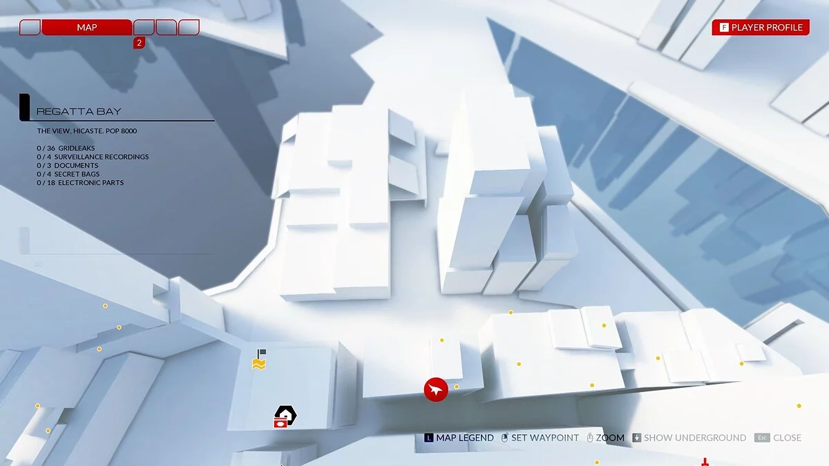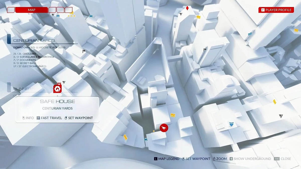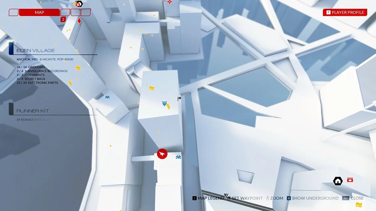 Имейте в виду, что некоторые документы, аудиозаписи и секретные сумки можно собрать, только внутри определенной сюжетной миссии. Вы можете проверить количество собираемых предметов в каждой миссии, открыв вкладку ЗАДАНИЕ в меню Mirror's Edge Catalyst. Не волнуйтесь, если что-то пропустите, так как каждую миссию можно перепройти, собрав все нужные для 100-процентного прохождения компоненты.