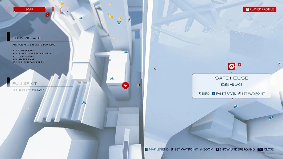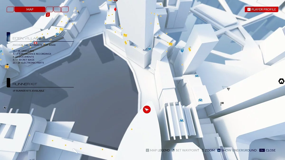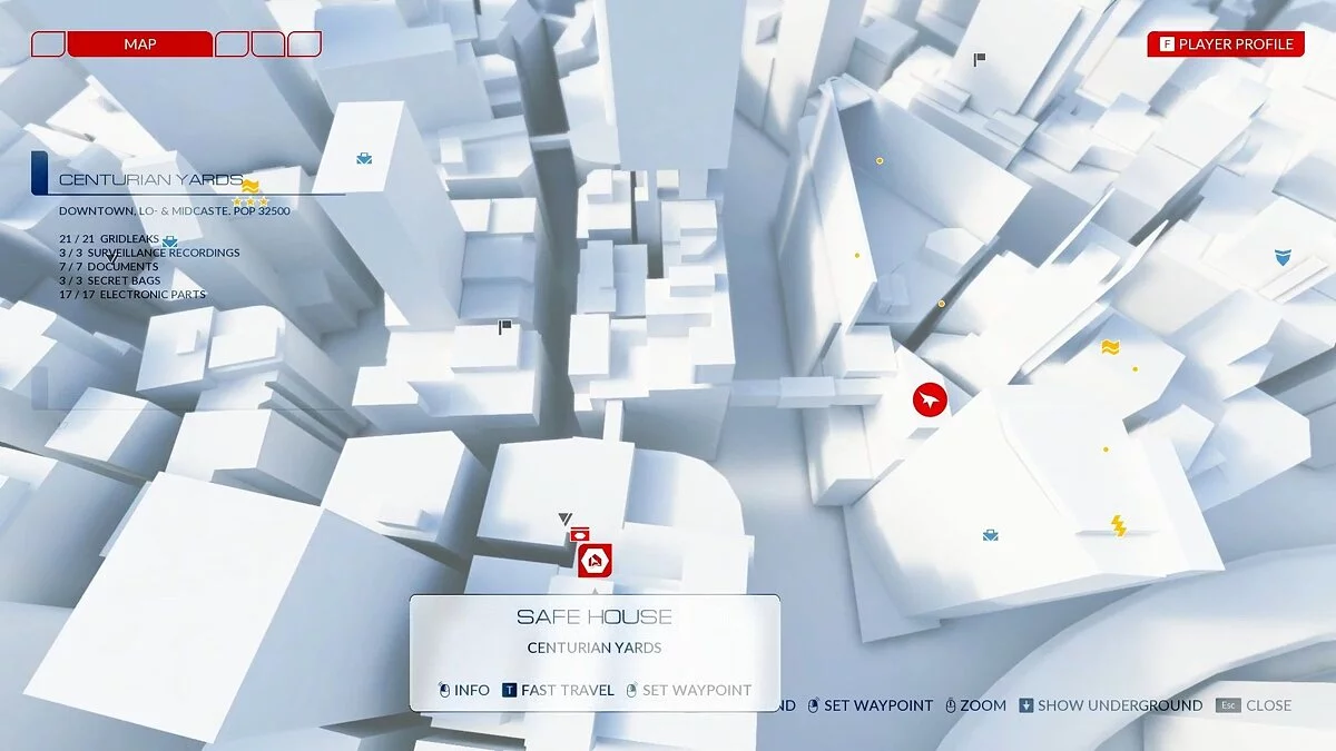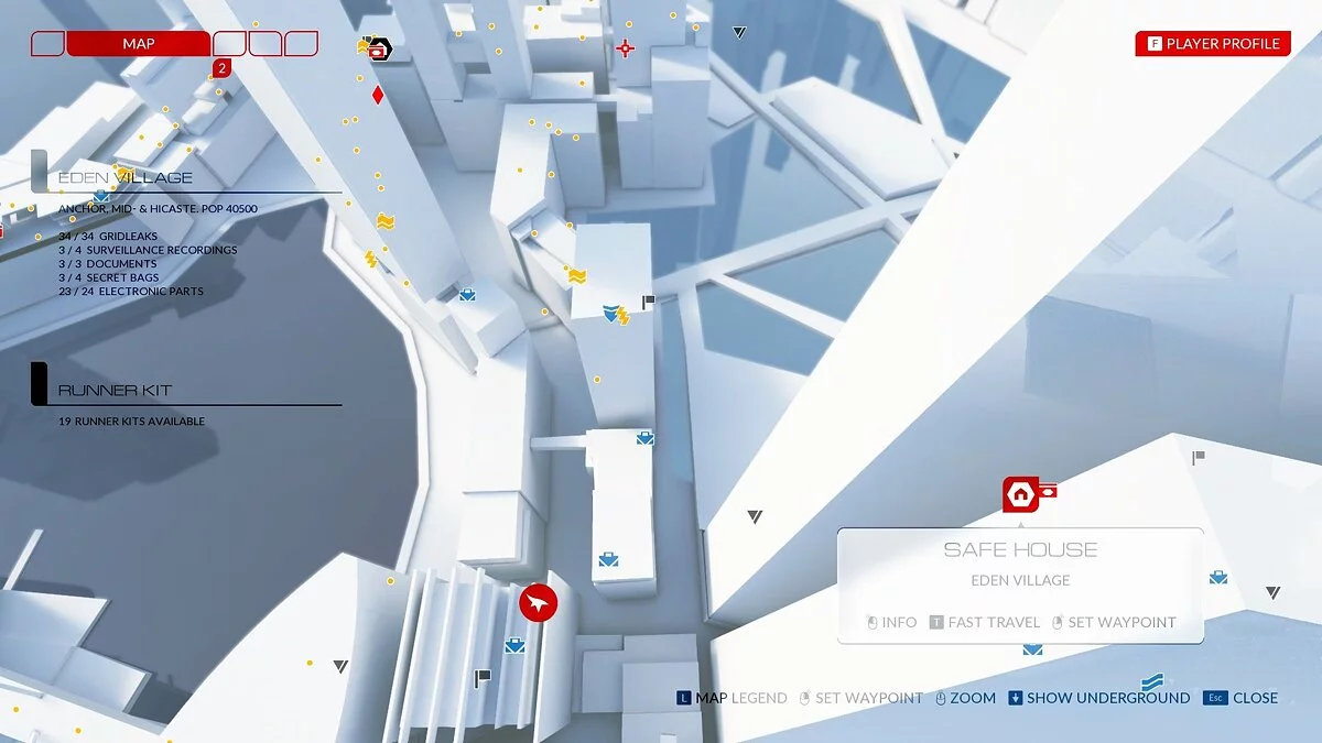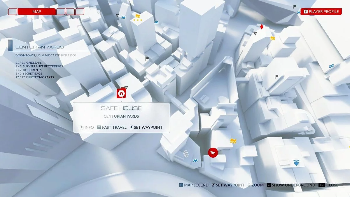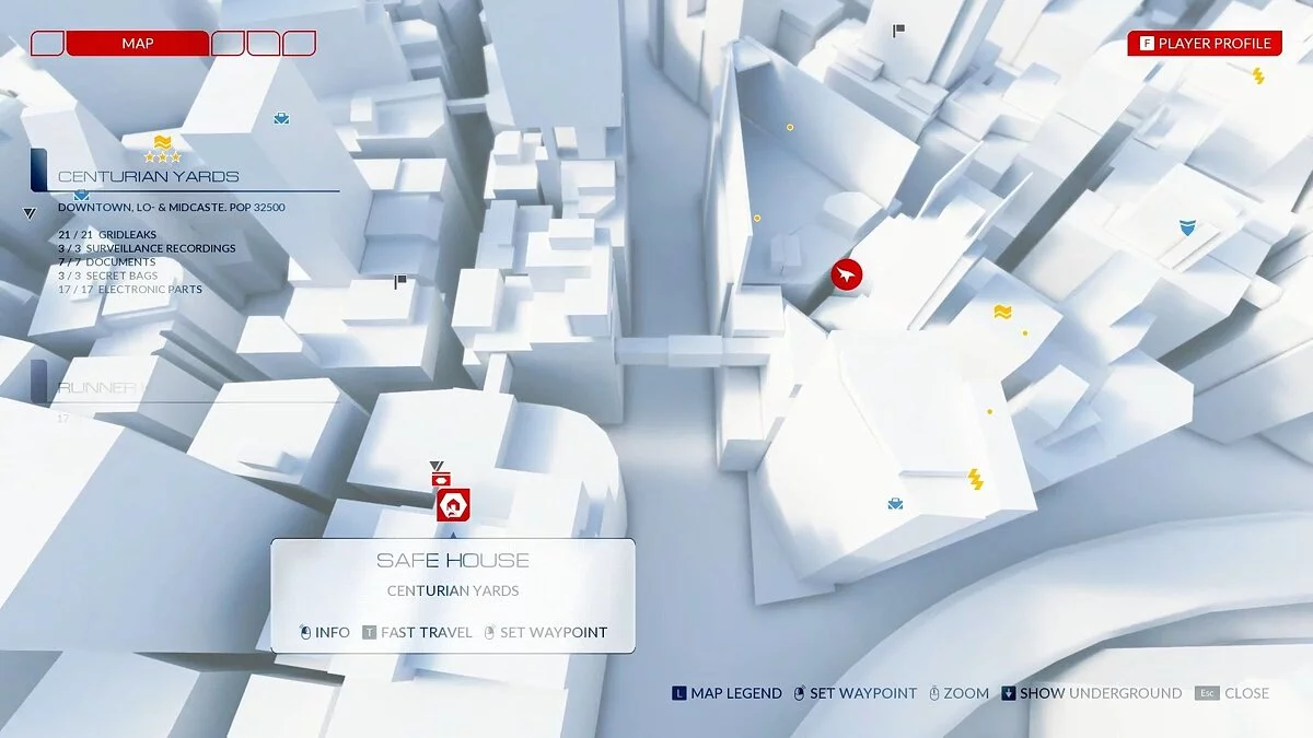 Имейте в виду, что некоторые документы, аудиозаписи и секретные сумки можно собрать, только внутри определенной сюжетной миссии. Вы можете проверить количество собираемых предметов в каждой миссии, открыв вкладку ЗАДАНИЕ в меню Mirror's Edge Catalyst. Не волнуйтесь, если что-то пропустите, так как каждую миссию можно перепройти, собрав все нужные для 100-процентного прохождения компоненты.